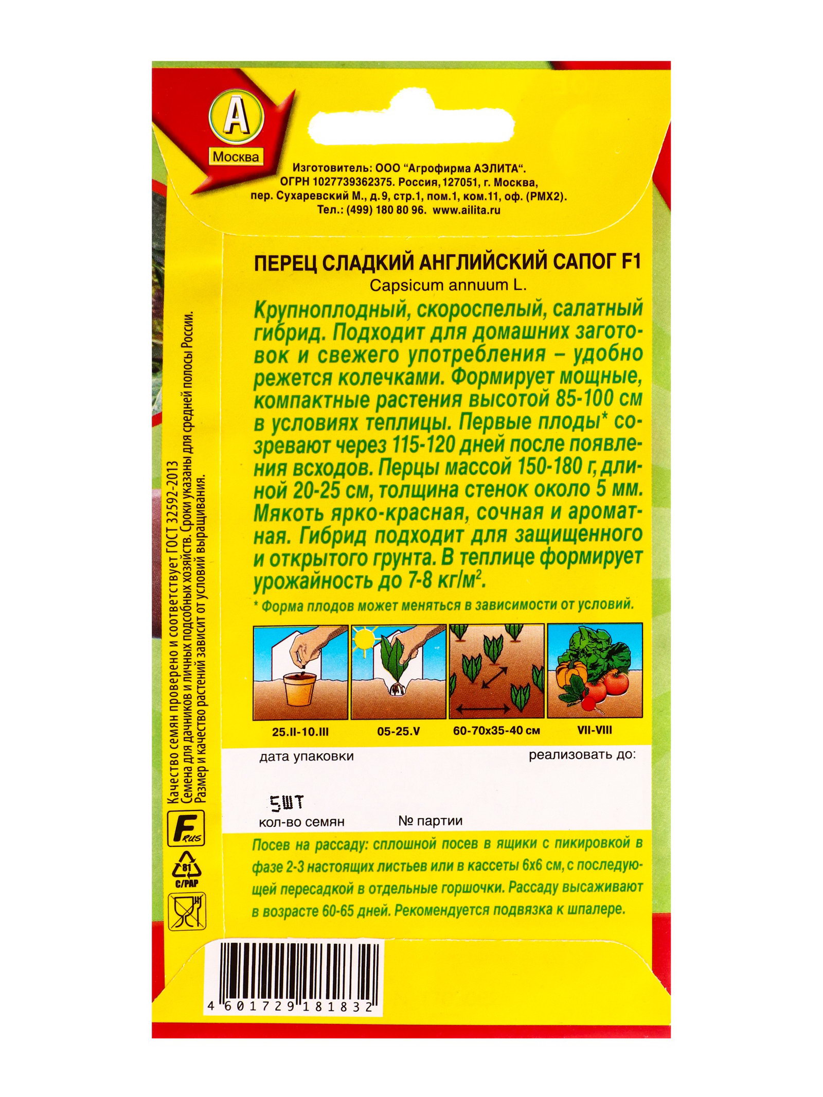 Семена Перец сладкий Английский сапог F1 Самое самое, Ц/П,5 шт., Агрофирма АЭЛИТА, Россия