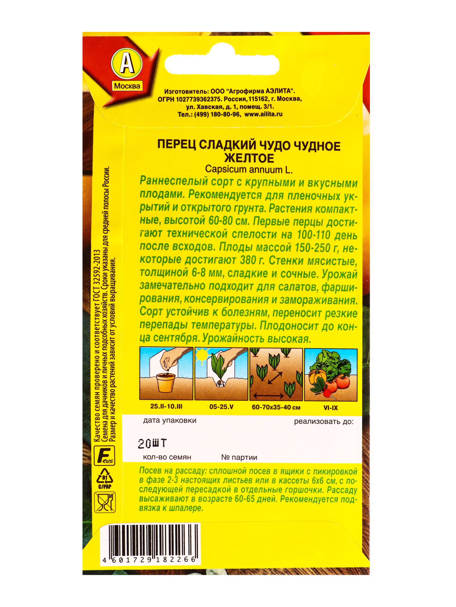 Семена Перец сладкий Чудо чудное желтое, Ц/П,20 шт., Агрофирма АЭЛИТА, Россия