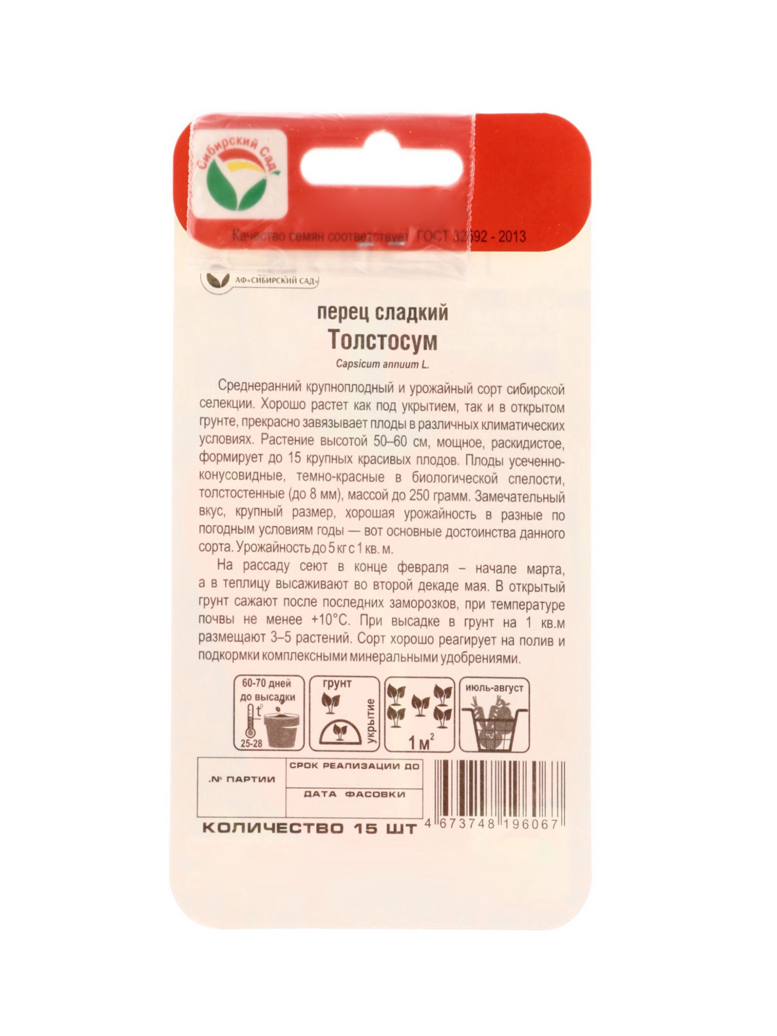Семена Перец ТОЛСТОСУМ 15шт, Сибирский сад, Россия