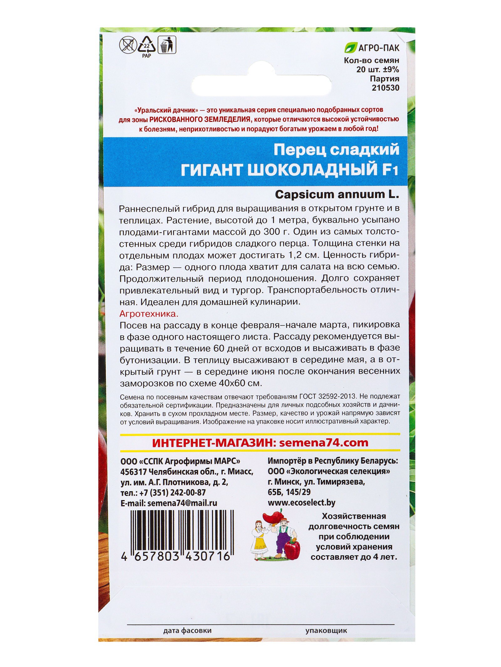 Семена Перец сладкий Гигант шоколадный F1, Уральский Дачник, Россия