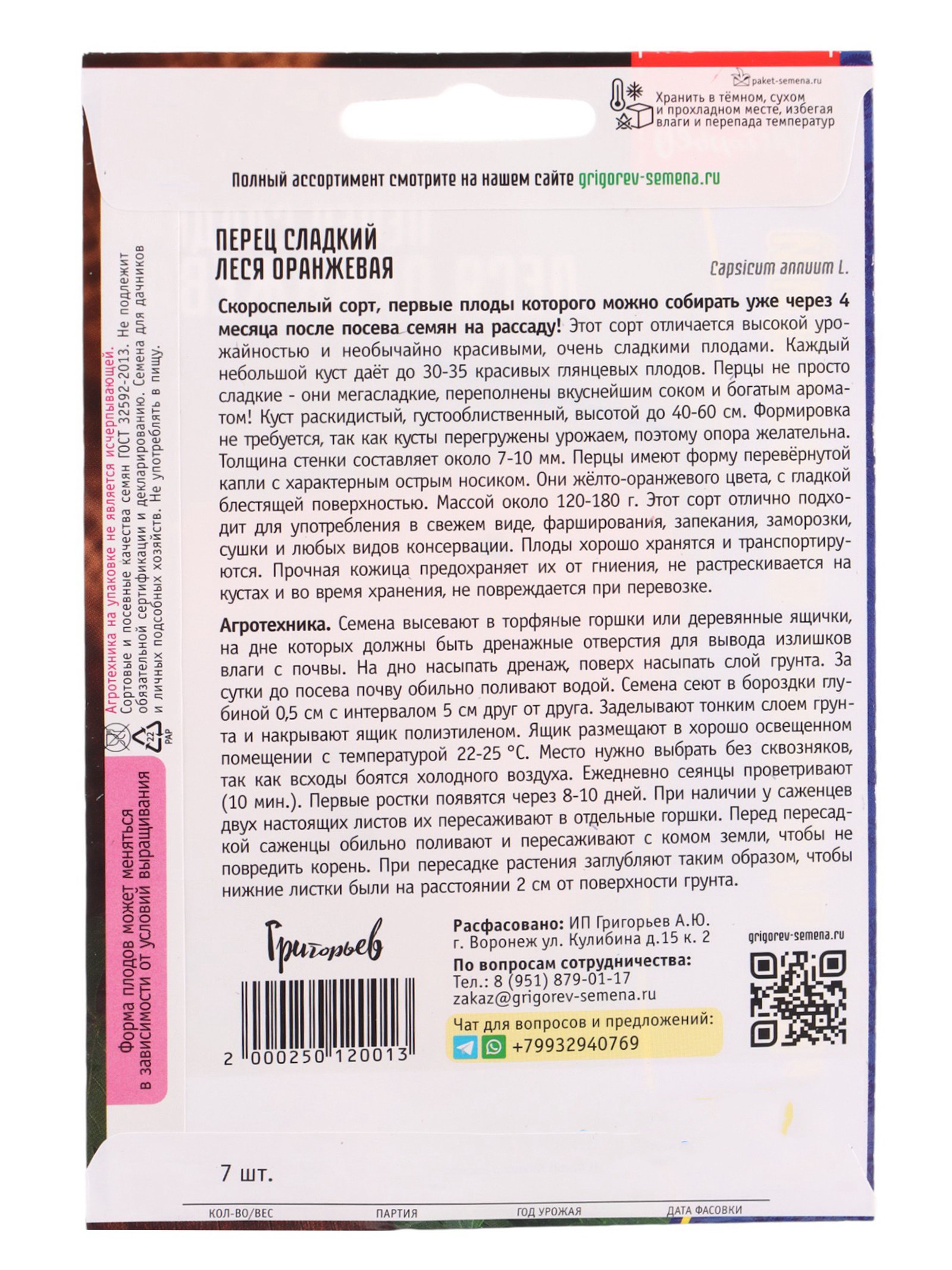 Семена Перец сладкий Леся Оранжевая 7 шт. 12.29 гр, Григорьев, Россия