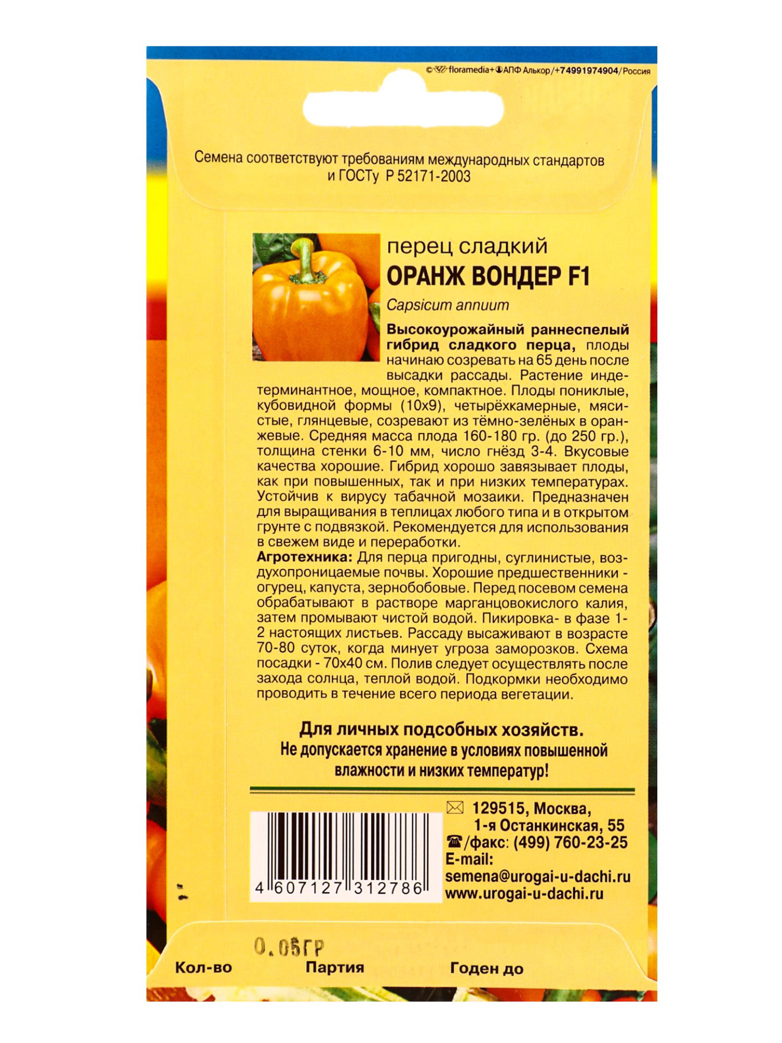 Семена Перец Оранж Вондер F1 0.05г., УРОЖАЙ УДАЧИ, Россия