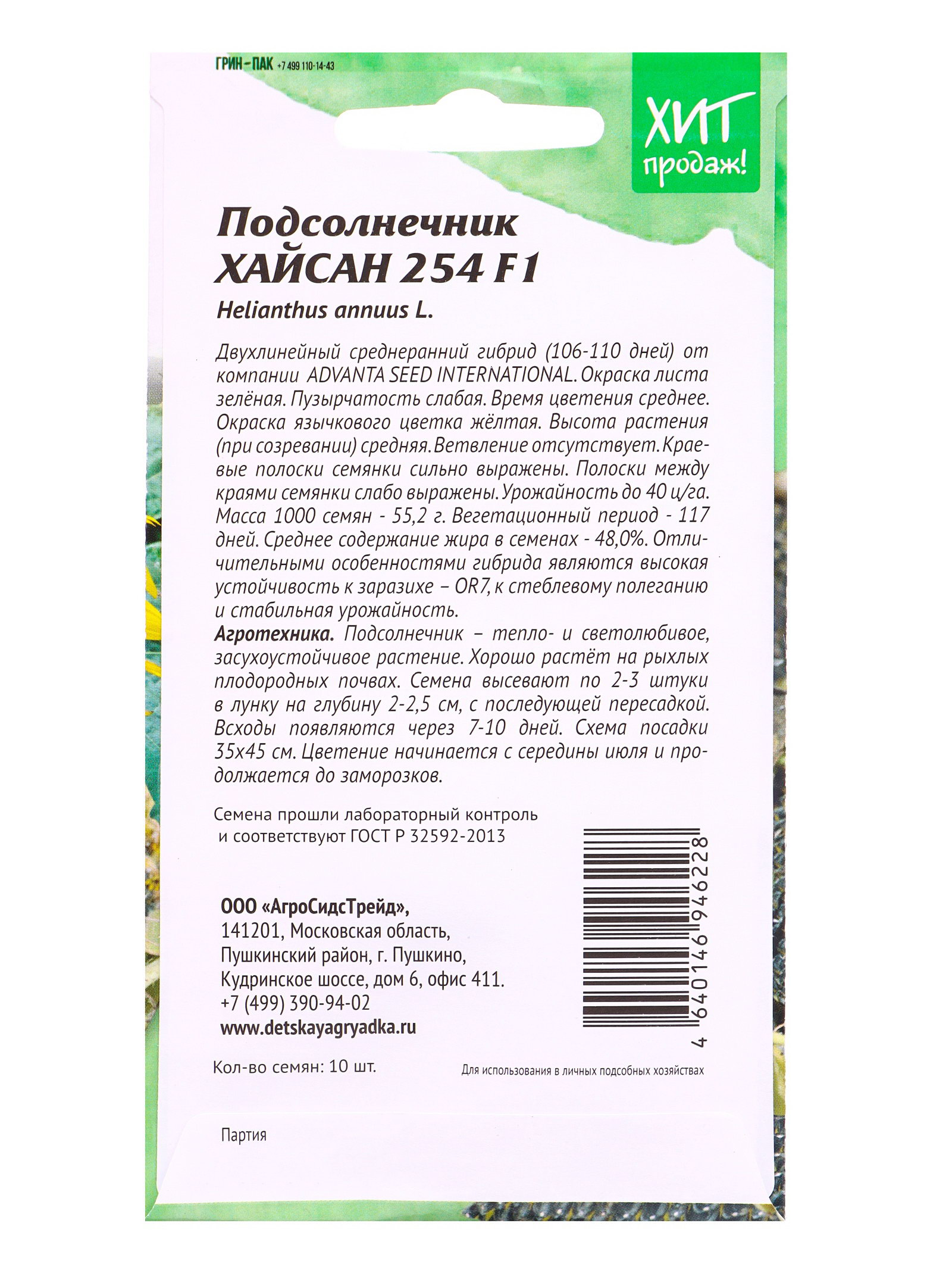 Семена Подсолнечник ХАЙСАН 254 10шт, Агросидстрейд, Россия