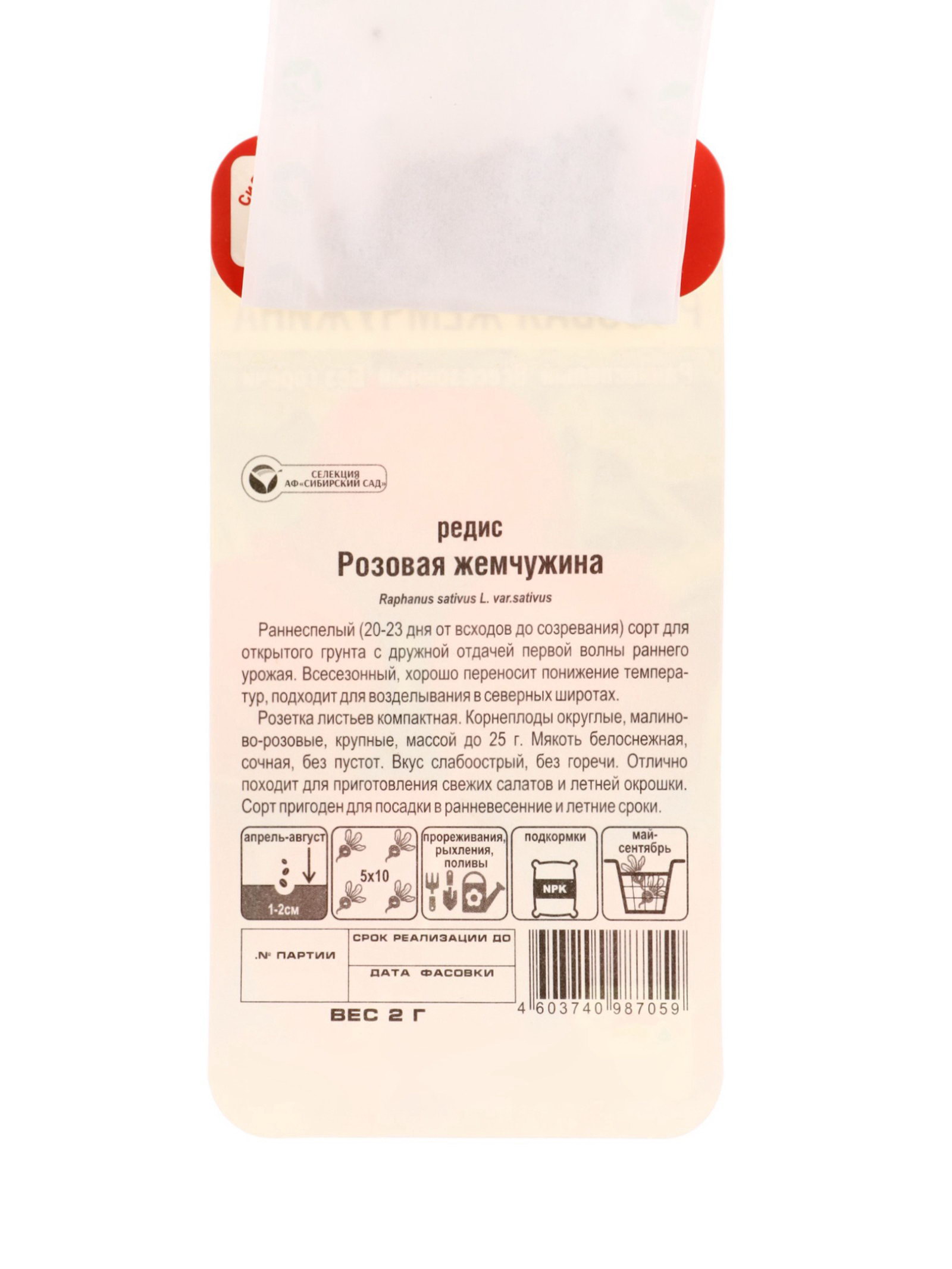 Размер упаковки: 8 x 0.2 x 15 см. Размер упаковки: 8 x 0.2 x 15 см. tnved: 1209999900 Температурное ограничение: Нет Место выращивания: Открытый грунт Упаковка: Цветная Сроки созревания: Ранний Сорт или гибрид: Сорт Вегетационный период, дни: 21 Раннеспелый (20-23 дня от всходов до созревания) сорт для открытого грунта с дружной отдачей первой волны раннего урожая. Всесезонный, хорошо переносит понижение температур, подходит для возделывания в северных широтах. Розетка листьев компактная. Корнеплоды округлые, малиново-розовые, крупные, массой до 25г. Мякоть белоснежная, сочная, без пустот. Вкус слабоострый, без горечи. Отлично походит для приготовления свежих салатов и летней окрошки. Сорт пригоден для посадки в ранневесенние и летние сроки. | ||