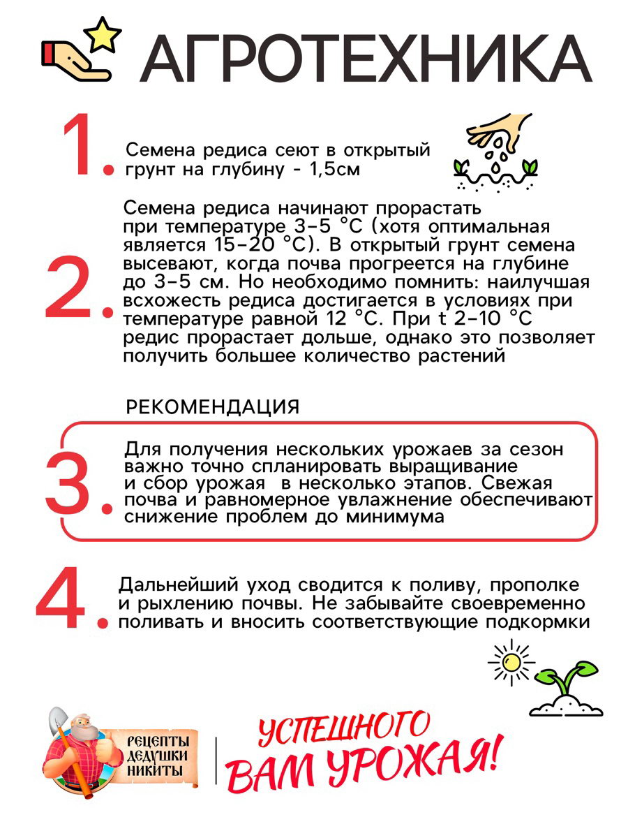 Размер упаковки: 8 x 0.2 x 15 см. Температурное ограничение: Нет Агрономический срок годности, лет: 4 tnved: 1209999900 tnved: 1209999900 Описание семян редиса "Французский завтрак" -Сорт: Французский завтрак -Вес: 1,5 г Характеристика: -Тип: Редис -Форма: Удлиненные, цилиндрические корнеплоды -Цвет: Ярко-красный с белым кончиком Особенности: Раннеспелый сорт, время созревания составляет 25-30 дней. Плоды достигают длины 10-12 см и имеют нежную, хрустящую мякоть. Отличается хорошей устойчивостью к стрелкованию и заболеваниям. Обладает освежающим вкусом, что делает его идеальным для салатов и закусок. Рекомендации по выращиванию: Посев семян рекомендуется проводить в марте-апреле или в августе-сентябре для осеннего урожая. Редис предпочитает легкие, богатые органическими веществами почвы и регулярный полив. Убирайте урожай, когда корнеплоды достигнут нужного размера, чтобы избежать их перерастания. Применение: Используется в кулинарии для приготовления свежих салатов, закусок и в качестве гарнира. Отлично подходит для употребления в сыром виде. Редис "Французский завтрак" станет прекрасным дополнением к вашему огороду, обеспечивая вкусные и ароматные корнеплоды! Советы при посеве | ||