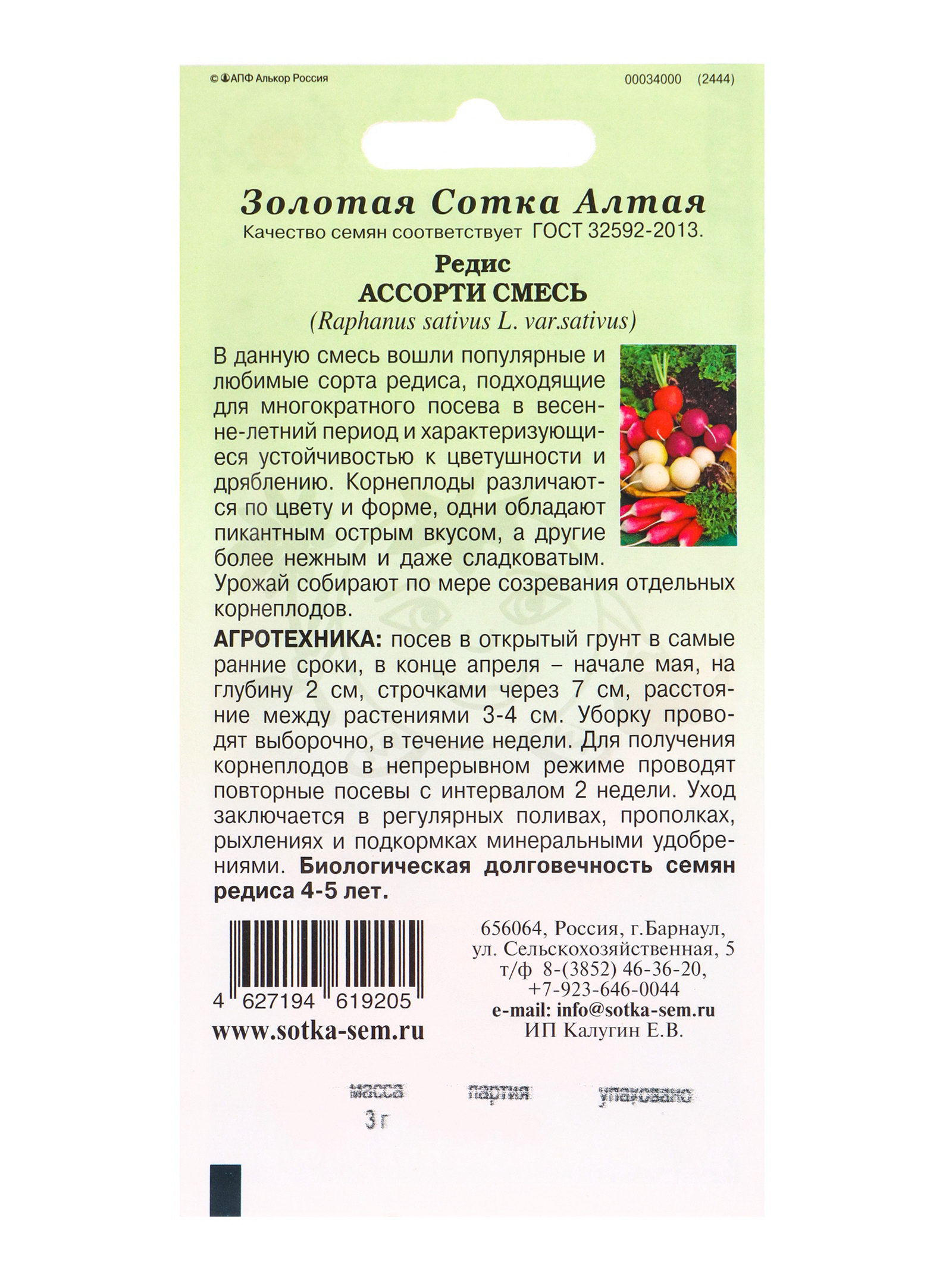 Семена Редис "Ассорти", смесь, 3 г, Золотая Сотка Алтая, Россия