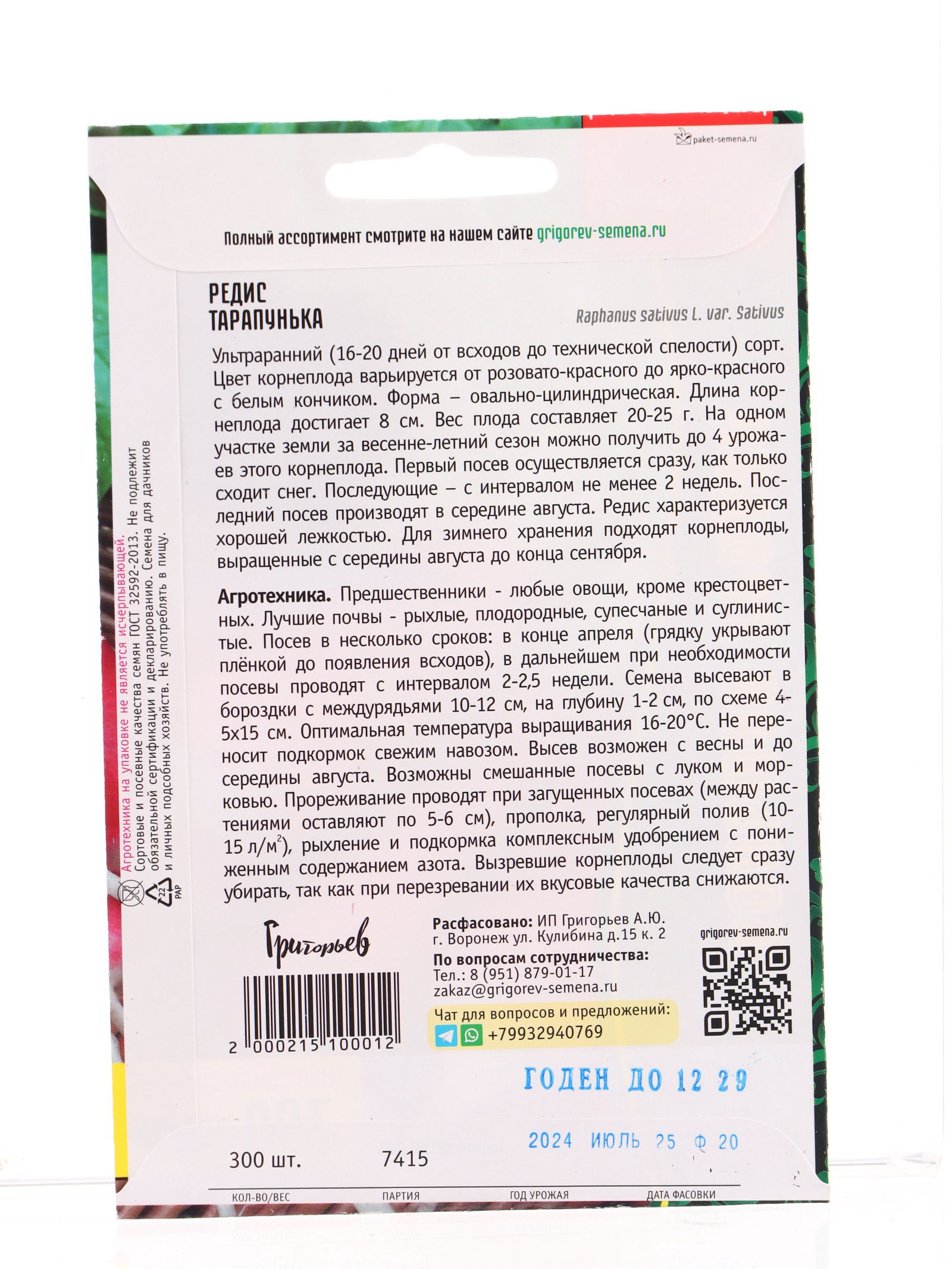 Семена Редис Тарапунька ВП 300 шт. 12.29 гр, Григорьев, Россия