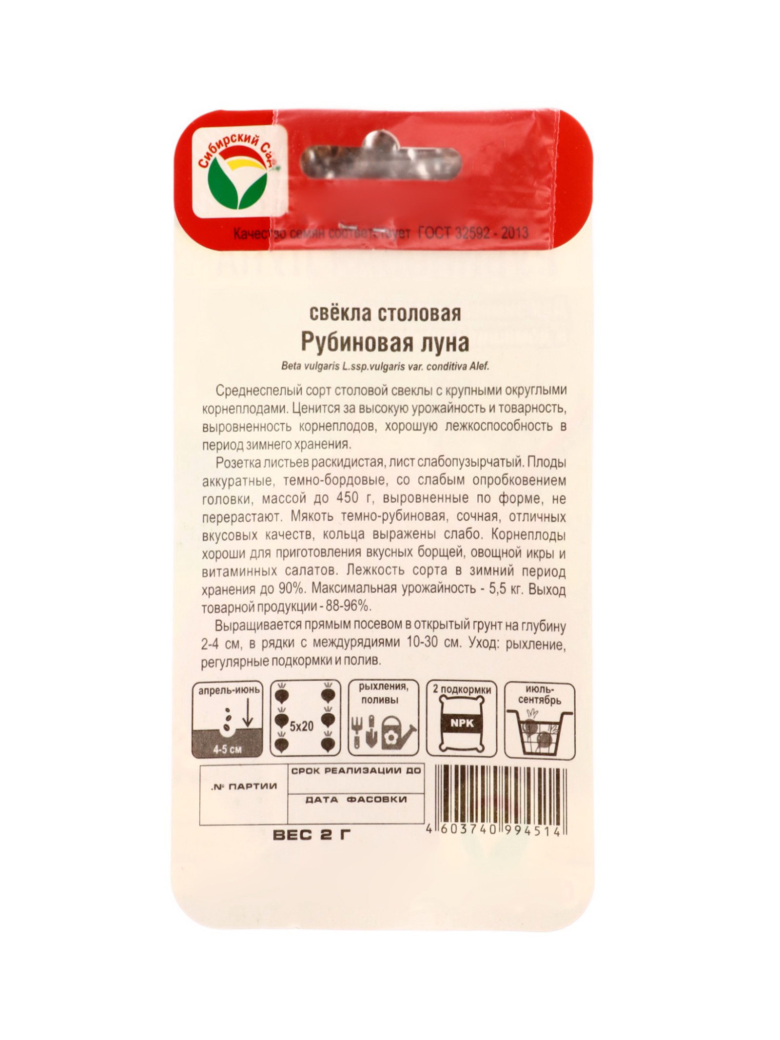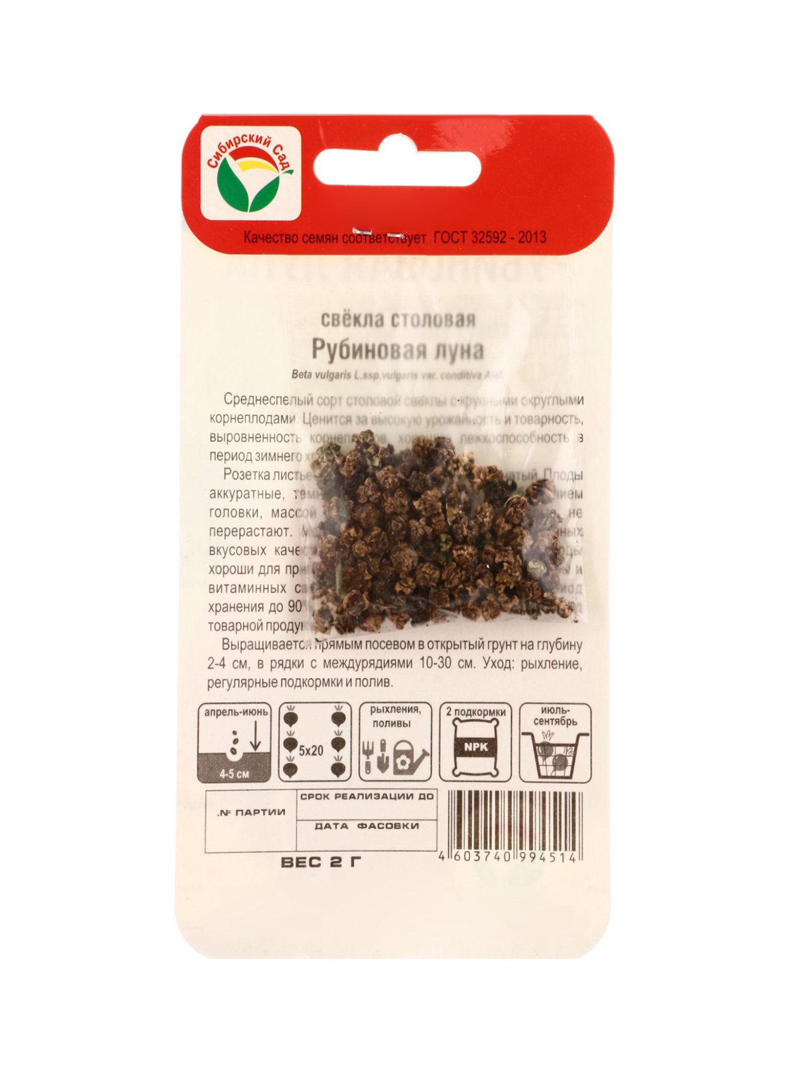 Семена Свекла Рубиновая луна 2г, Сибирский сад, Россия