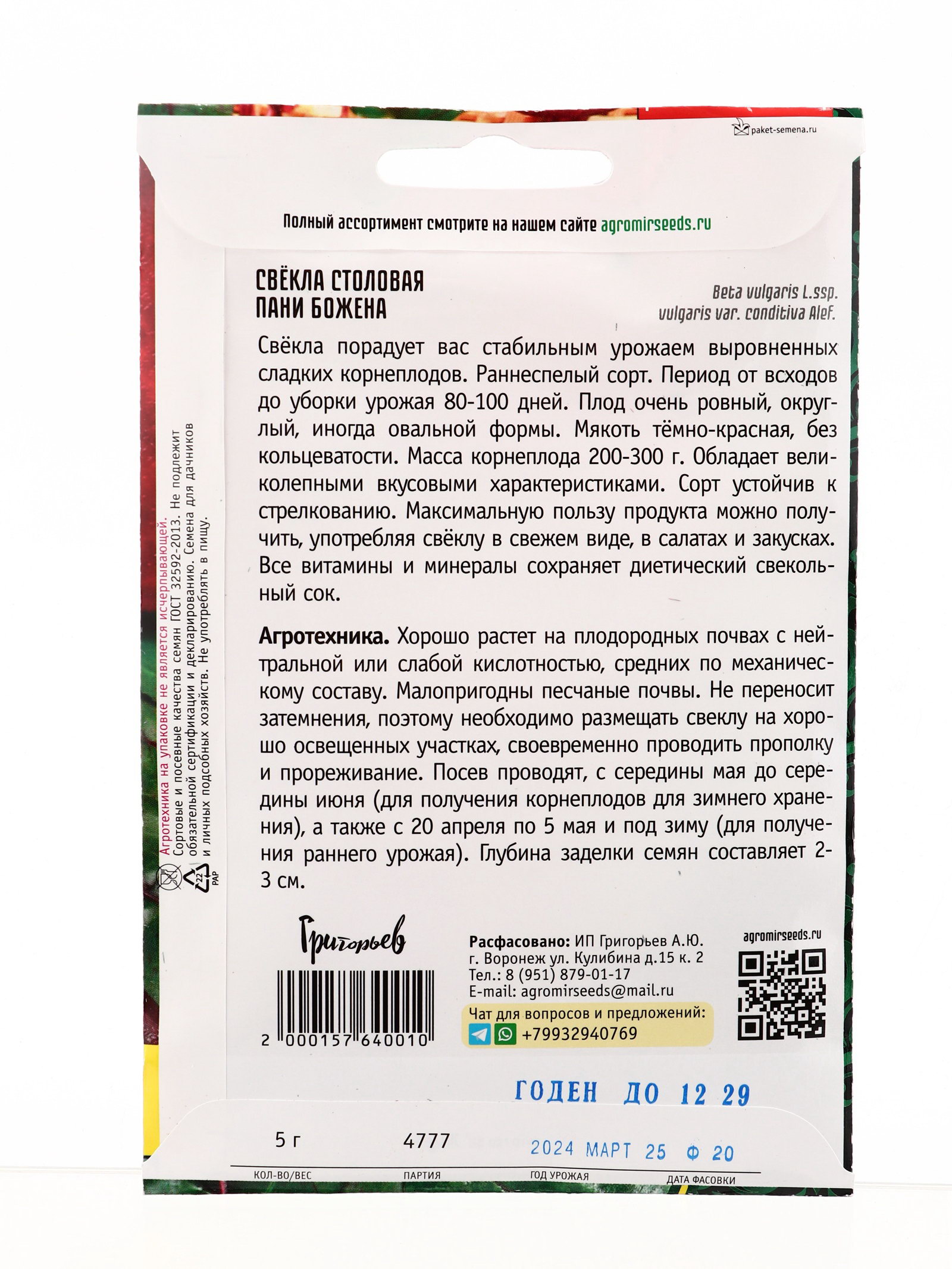 Семена Свёкла Пани Божена столовая 5г. 12.29 гр, Григорьев, Россия