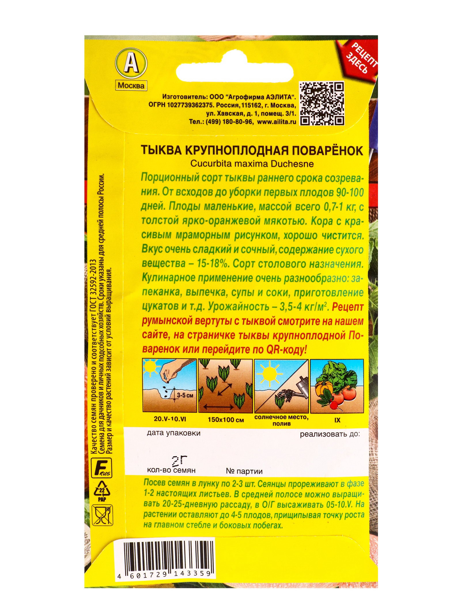 Семена Тыква крупноплая Поваренок Блюда стран мира, Ц/П,2 г, Агрофирма АЭЛИТА, Россия