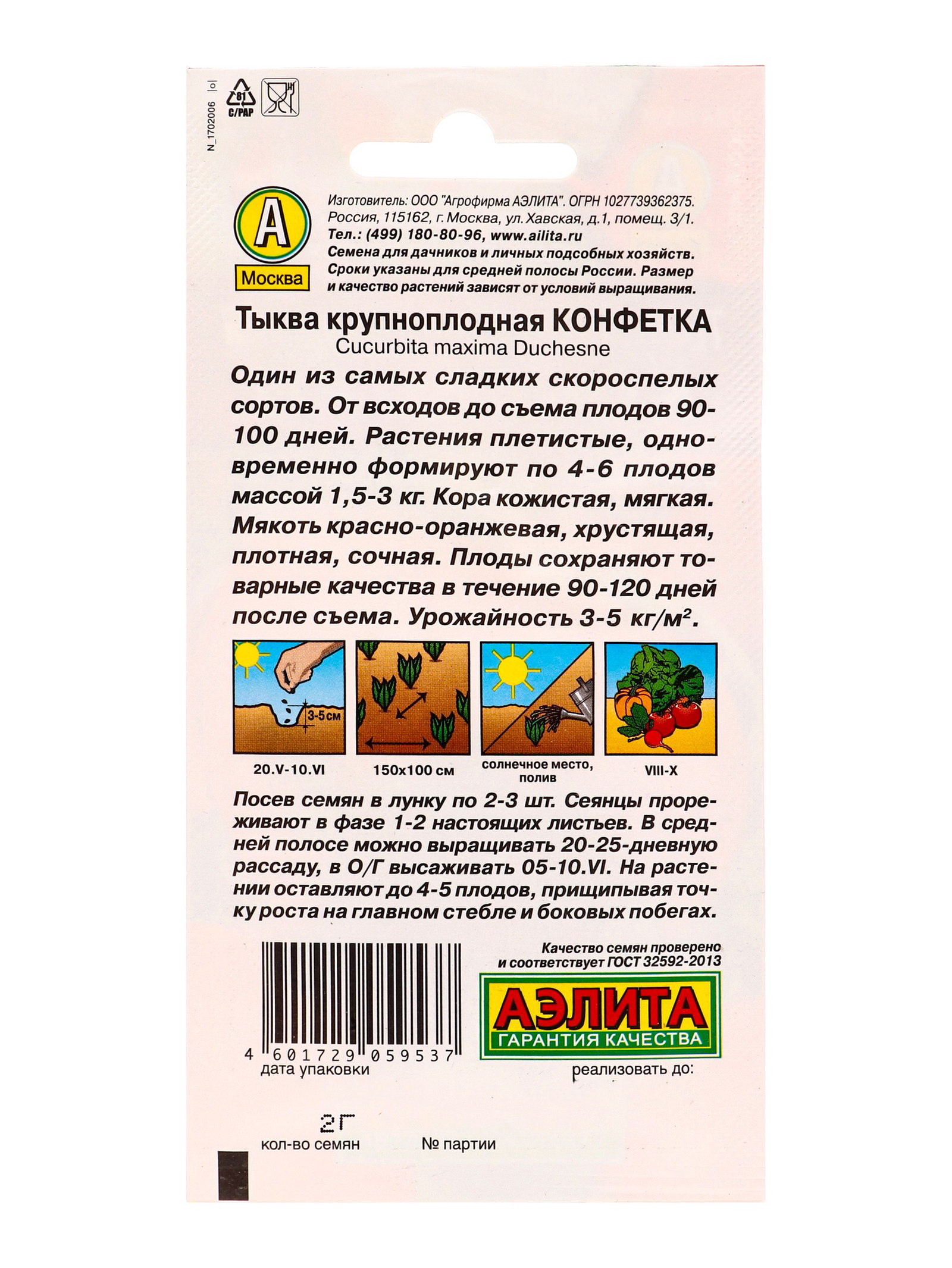 Семена Тыква крупноплая Конфетка, Ц/П,2 г, Агрофирма АЭЛИТА, Россия