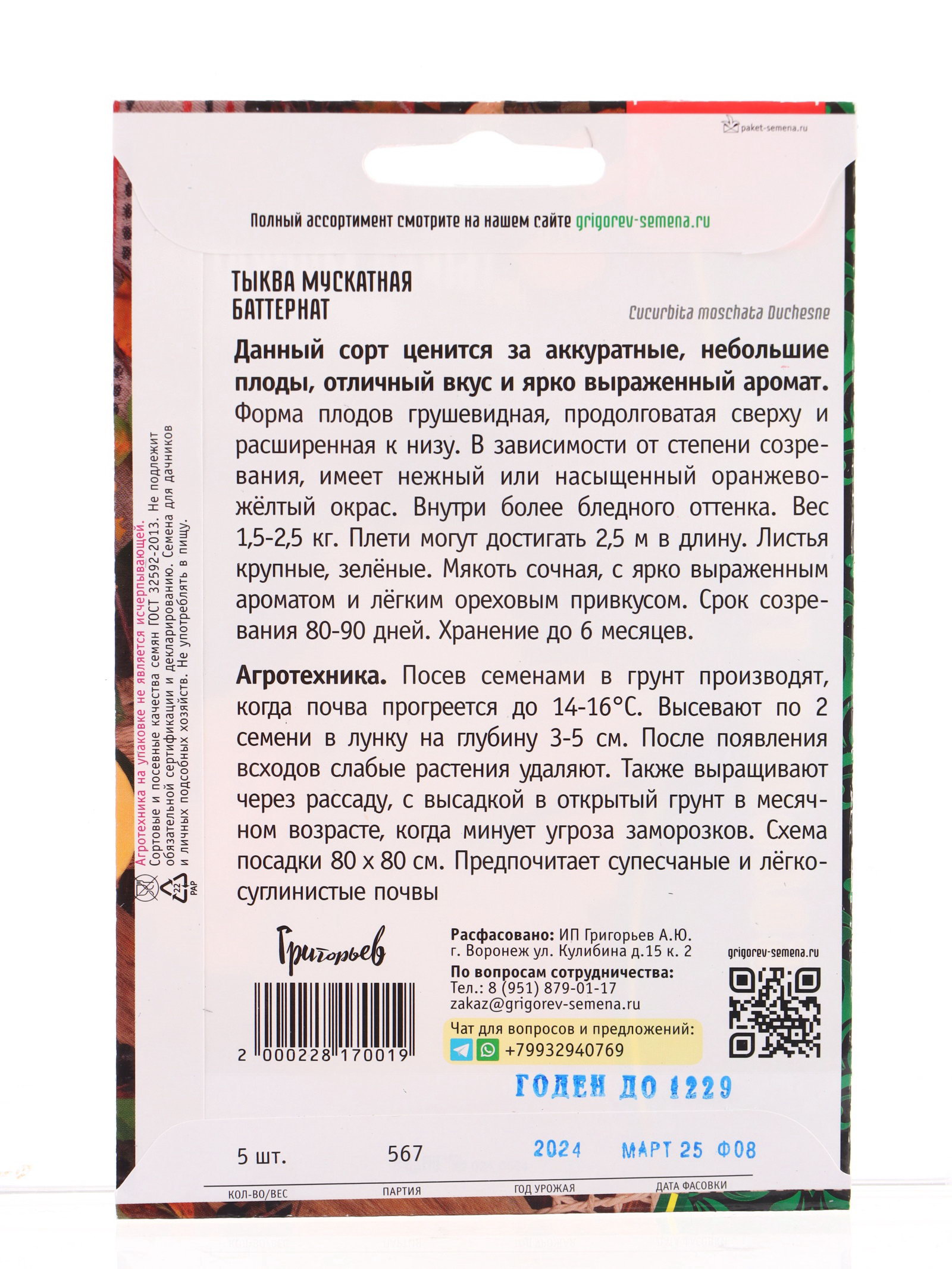 Семена Тыква Баттернат мускатная 5 шт. 12.29 гр, Григорьев, Россия