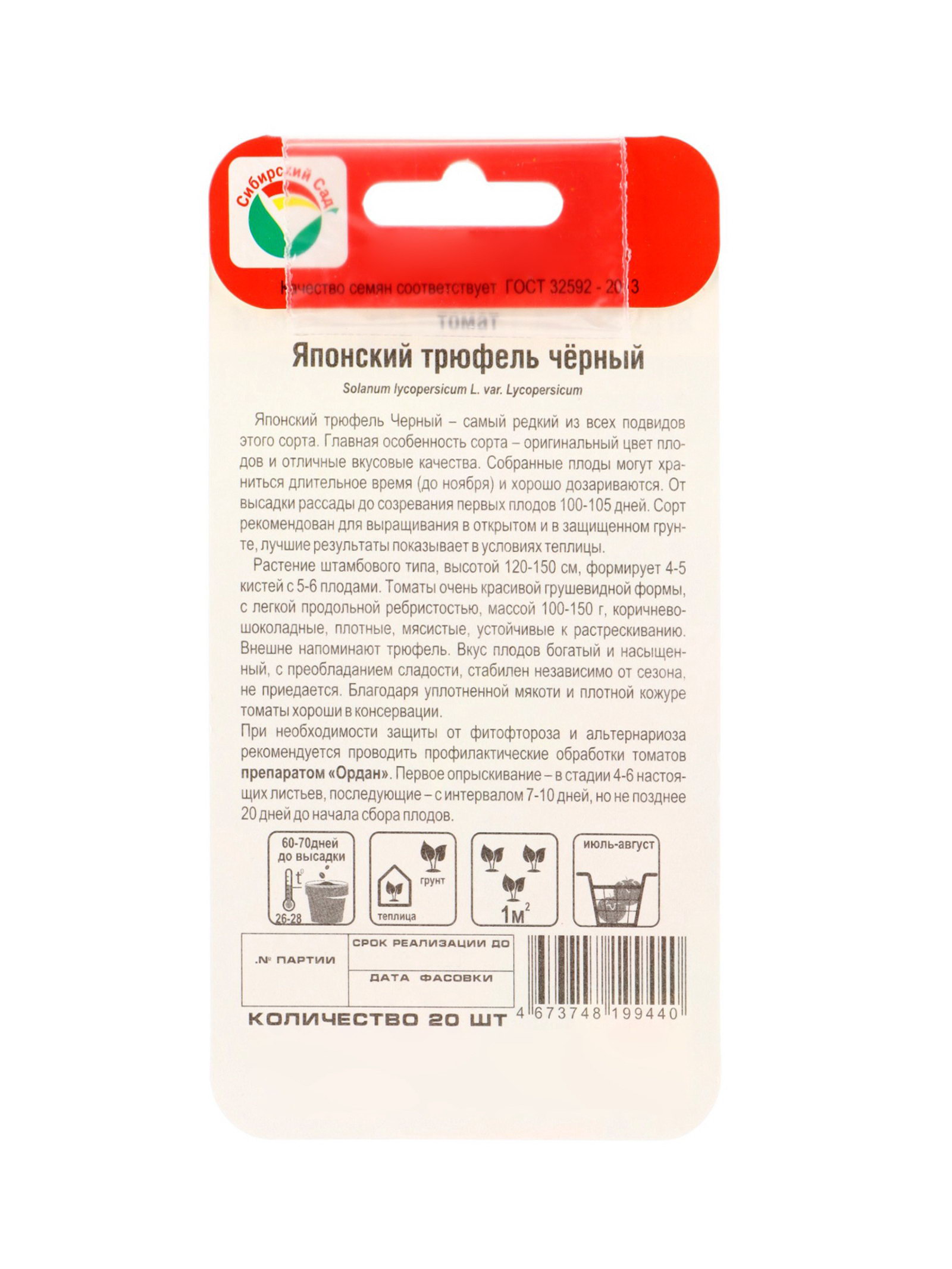 Посев на рассаду: Апрель, Март Размер упаковки: 8 x 0.1 x 15 см. Вьющиеся (лианы): Да Ампельные: Да Тип роста: Детерминантный (среднерослый) Сорт: Японский трюфель tnved: 1209918000 Вес: Среднеплодные (от 25 до 150 г) Применение: Универсальное Нуждаются в пасынковании: Нет Температурное ограничение: Нет Сроки созревания: Средний Упаковка: Цветная Место выращивания: Универсальный Сорт или гибрид: Сорт Вегетационный период, дни: 110 Цвет: Чёрный Форма томатов: Грушевидные Среднеспелый сорт с оригинальными плодами в виде трюфеля, высотой до 160 см Интересная компактная форма, оригинальный сладковато-кислый вкус и отличная плотная консистенция плодов делают этот сорт фаворитом цельноплодного консервирования среди томатов, а вкус свежих салатов получил высшую оценку даже у настоящих гурманов. Сорт рекомендован для выращивания в теплицах и пленочных укрытиях. Растение высокорослое, выращивается в 1-2 стебля, требует подвязки и пасынкования. В кисти 5-6 красивых оранжевых плодов весом 100-150 г, с плотной кожицей, сахаристой мякотью и великолепным вкусом. Томаты лежкие, хорошо дозариваются, долго не теряют вкусовых качеств при хранении в свежем виде, не трескаются при консервировании. Сорт хорошо реагирует на полив и подкормки комплексными минеральными удобрениями. При необходимости защиты от фитофтороза и альтернарио- за рекомендуется проводить профилактические обработки томатов препаратом "Ордан". Первое опрыскивание в стадии 4-6 настоящих листьев, последующие с интервалом 7-10 дней, но не позднее 20 дней до начала сбора плодов. | ||