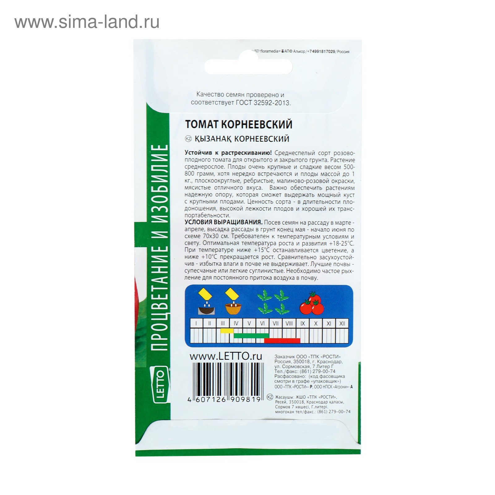 Размер упаковки: 8 x 0.1 x 15 см. Вид грунта: Открытый Сроки созревания: Средний tnved: 1209913000 Место выращивания: Закрытый грунт (теплицы, укрытия) Сорт или гибрид: Сорт Упаковка: Цветная Вегетационный период, дни: 105 Форма томатов: Плоскоокруглые Цвет: Красный Семена "Томат Корнеевский", розовый, 0,1 г среднеспелый сорт для открытого и закрытого грунта. Растение среднерослое. Плоды очень крупные и сладкие весом 500–800 грамм, хотя нередко встречаются и плоды массой до 1 кг, плоскоокруглые, ребристые, малиново-розовой окраски, мясистые, отличного вкуса. Важно обеспечить растениям надёжную опору, которая сможет выдержать мощный куст с крупными плодами. Ценность сорта: в длительности плодоношения, высокой лёжкости плодов и их хорошей транспортабельности. Условия выращивания: посев семян на рассаду в марте-апреле, высадка рассады в грунт: конец мая начало июня по схеме 70х30 см Требователен к температурным условиям и свету. Оптимальная температура роста и развития: +18–25 ℃. При температуре ниже +15 ℃ останавливается цветение, а ниже +10 ℃ прекращается рост. Сравнительно засухоустойчив избытка влаги в почве не выдерживает. Лучшие почвы: супесчаные или лёгкие суглинистые. Необходимо частое рыхление для постоянного притока воздуха в почву. | ||