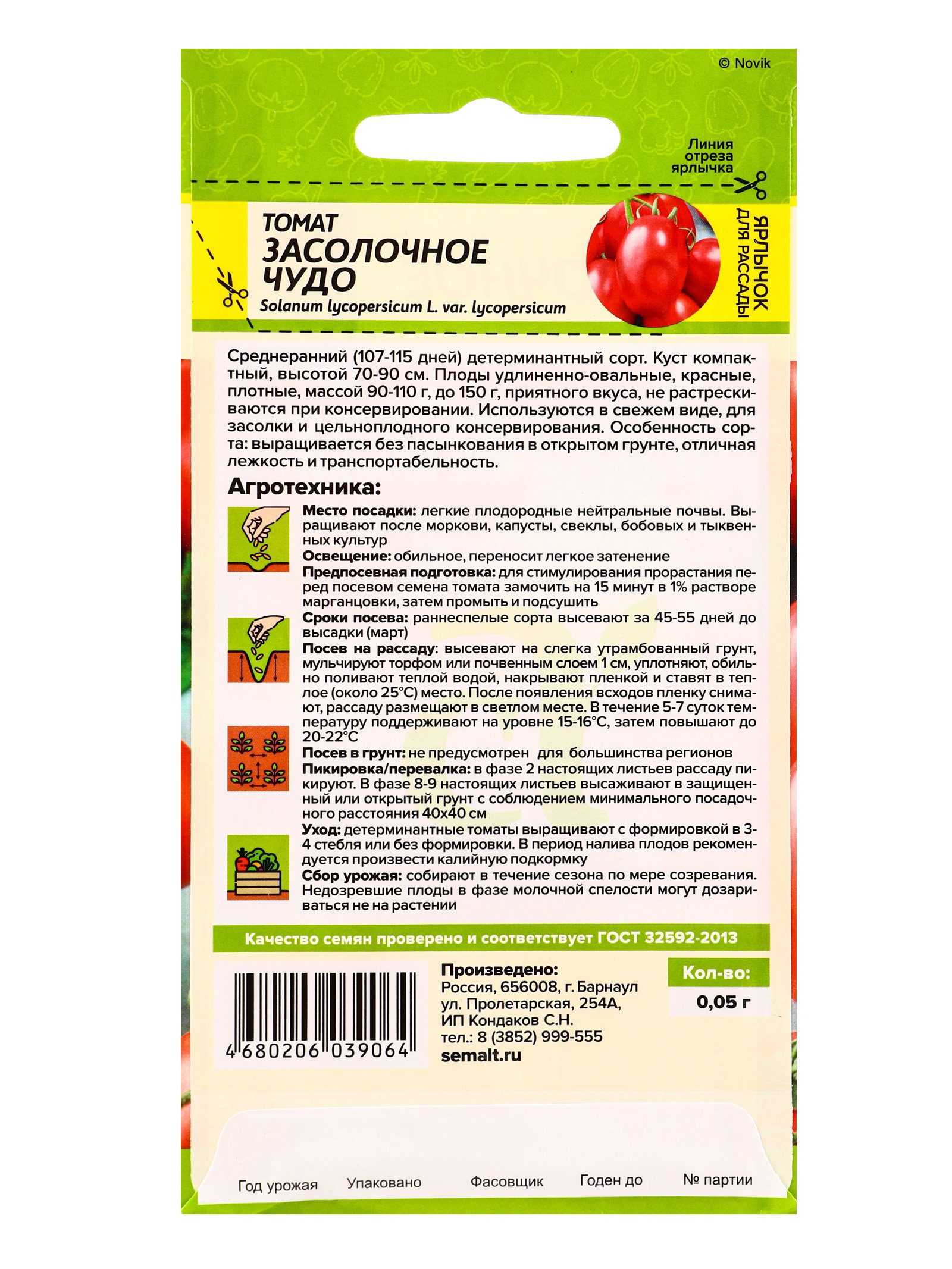 Применение: Для засолки и маринования, Для салатов Размер упаковки: 8 x 0.2 x 15 см. Сорт: Засолочное Чудо Тип роста: Детерминантный (среднерослый) tnved: 1209918000 Нуждаются в пасынковании: Нет Посев на рассаду: Март Вес: Среднеплодные (от 25 до 150 г) Сроки созревания: Средний Упаковка: Цветная Сорт или гибрид: Сорт Место выращивания: Открытый грунт Вегетационный период, дни: 122 Цвет: Красный Форма томатов: Грушевидные Среднеранний сорт. Куст компактный, высотой 70-90 см Плоды удлиненно-овальные, красные, плотные, массой 90-110 г, до 150 г, приятного вкуса. Используется в свежем виде, для засолки и цельно-плодного консервирования. Особенность сорта: выращивается без пасынкования в открытом грунте. В марте семена высевают на слегка утрамбованный грунт, мульчируют торфом или почвенным слоем 1,0 см, поливают теплой водой через ситечко, накрывают пленкой и ставят в теплое (около 25℃) место. После появления всходов пленку снимают, рассаду размещают в светлом месте. В течение 5-7 суток температуру поддерживают на уровне 15-16℃, затем повышают до 20-22℃. В фазе 1-2 настоящих листьев рассаду пикируют. 60-65-дневную рассаду в фазе 6-7 настоящих листьев и хотя бы одной цветочной кисти высаживают в защищенный или открытый грунт. | ||
