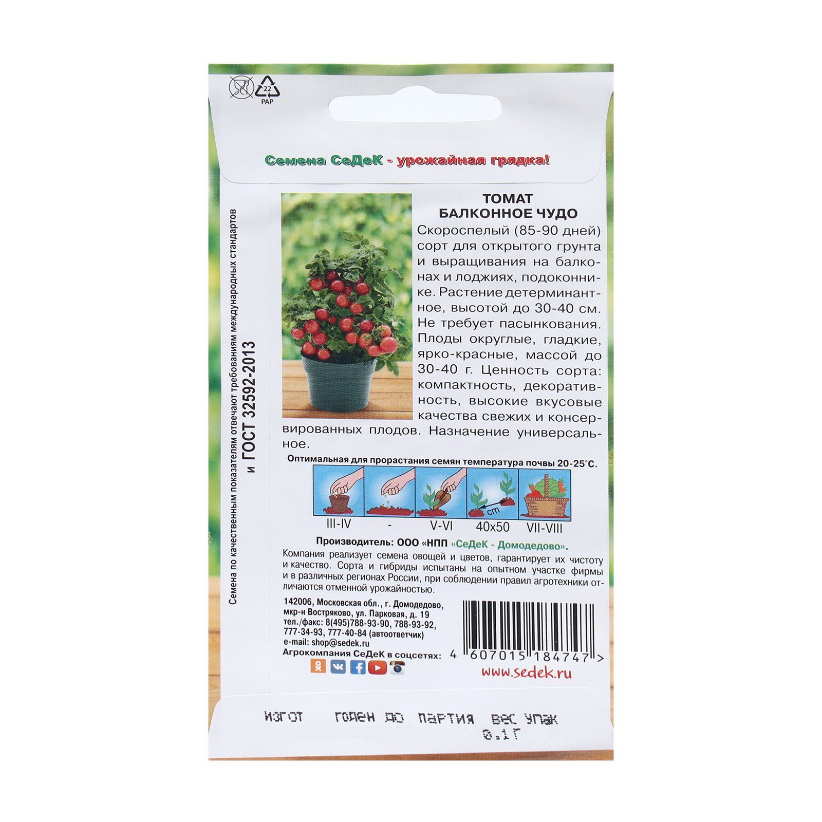 Место выращивания: Открытый грунт, Подоконник, балкон Размер упаковки: 8 x 0.1 x 15 см. Форма томатов: Круглые tnved: 1209918000 Посев на рассаду: Март Нуждаются в пасынковании: Нет Применение: Универсальное Вес: Среднеплодные (от 25 до 150 г) Тип роста: Супердетерминантный (низкорослый) Температурное ограничение: Нет Сроки созревания: Средний Сорт или гибрид: Сорт Цвет: Красный Скороспелый сорт для открытого грунта и пленочных укрытий. От полных всходов до начала плодоношения 80-85 дней. Куст низкорослый, штамбовой формы, компактный, среднеоблиственный, высотой 30-40 см, не требующий пасынкования. Что касается подвязки – она ему необходима, так как куст может полегать под тяжестью плодов (урожайность с одного куста может доходить до 2 кг и более). Ценится за декоративность и возможность выращивания в контейнерах в домашних условиях: на подоконнике, балконе. Плоды округлой формы, гладкие, интенсивно-красного цвета, массой 20-30 г, очень сладкие и ароматные, поэтому нравятся детям. Из них можно приготовить вкусные весенние салаты, десерты и маринады. Плотность посадки 5-7 растений/м2. Урожайность 10-12 кг/м2. | ||