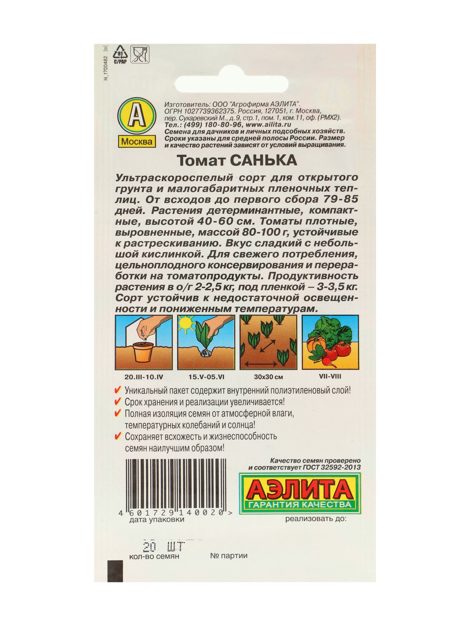 Посев на рассаду: Апрель, Март Применение: Для засолки и маринования, Для салатов Размер упаковки: 11.5 x 1 x 19 см. tnved: 1209918000 Вес: Среднеплодные (от 25 до 150 г) Нуждаются в пасынковании: Нет Форма томатов: Круглые Сроки созревания: Сверхранний (скороспелый) Сорт или гибрид: Сорт Тип роста: Детерминантный (среднерослый) Цвет: Красный Ультраскороспелый сорт для открытого грунта и малогабаритных пленочных теплиц. От всходов до первого сбора 79-85 дней. Растения детерминантные, компактные, высотой 40-60 см Томаты плотные, выровненные, массой 80-100 г, устойчивые к растрескиванию. Вкус сладкий с небольшой кислинкой. • Для свежего потребления, цельноплодного консервирования и переработки на томатопродукты. • Продуктивность растения в ог 2-2,5 кг, под пленкой 3-3,5 кг • Сорт устойчив к недостаточной освещенности и пониженным температурам. strong>Посев: strong> на рассаду с обязательной пикировкой в фазе 1–2 настоящих листьев. Помещайте в грунт рассаду в возрасте 45–55 дней по 4–5 шт. на 1 ?2. Осуществляйте регулярные поливы, прополки, рыхления и подкормки. | ||
