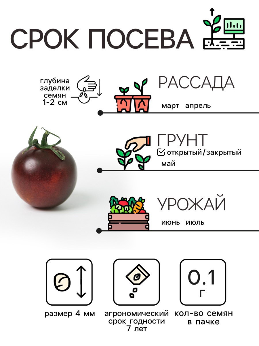Размер упаковки: 8 x 0.2 x 15 см. Агрономический срок годности, лет: 4 Агрономический срок годности, лет: 4 tnved: 1209918000 Описание семян томата "Черный Мавр" -Сорт: Черный Мавр -Вес: 0,1 г Характеристика: -Тип: Томат -Форма плодов: Округлая -Цвет плодов: Темно-фиолетовый, почти черный Особенности: Среднеспелый сорт, время от всходов до уборки составляет 100-110 дней. Плоды средние, весом около 50-60 гр Имеют сладкий, богатый вкус и нежную мякоть. Устойчив к основным заболеваниям, включая фитофтороз. Рекомендации по выращиванию: Посев семян рекомендуется проводить в теплицу или на открытый грунт после окончания заморозков. Растения предпочитают солнечные участки и плодородные, хорошо дренированные почвы. Регулярный полив и удобрение способствуют обильному плодоношению. Применение: Идеально подходит для свежих салатов, соусов и консервирования. Плоды можно использовать в кулинарии для приготовления различных блюд. Томат "Черный Мавр" станет отличным выбором для вашего огорода, обеспечивая не только вкусный, но и экзотичный урожай! Советы при посеве | ||