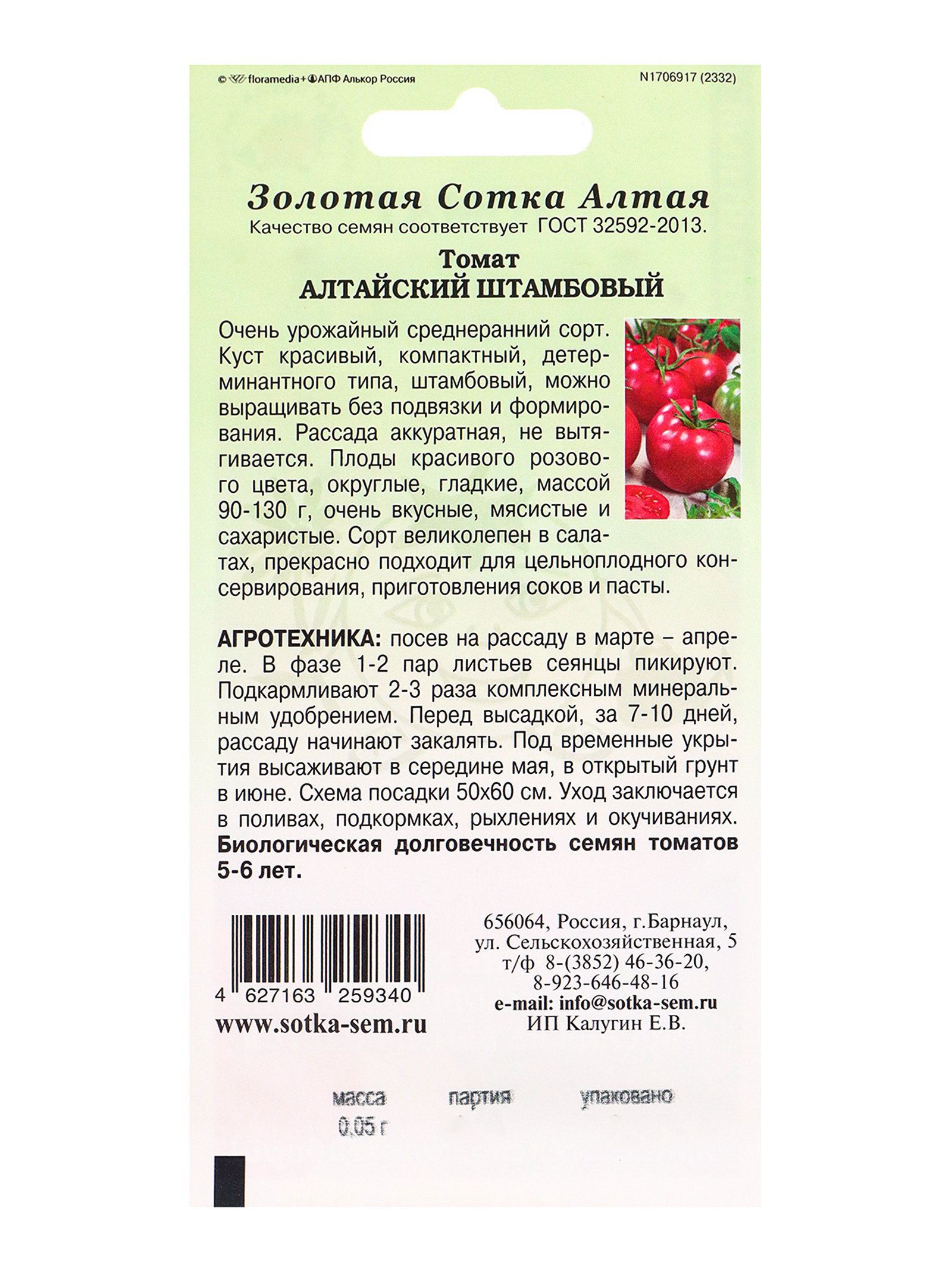 Семена Томат "Алтайский штамбовый", 0.05 г, среденеранний, детерминантный, Золотая Сотка Алтая, Россия