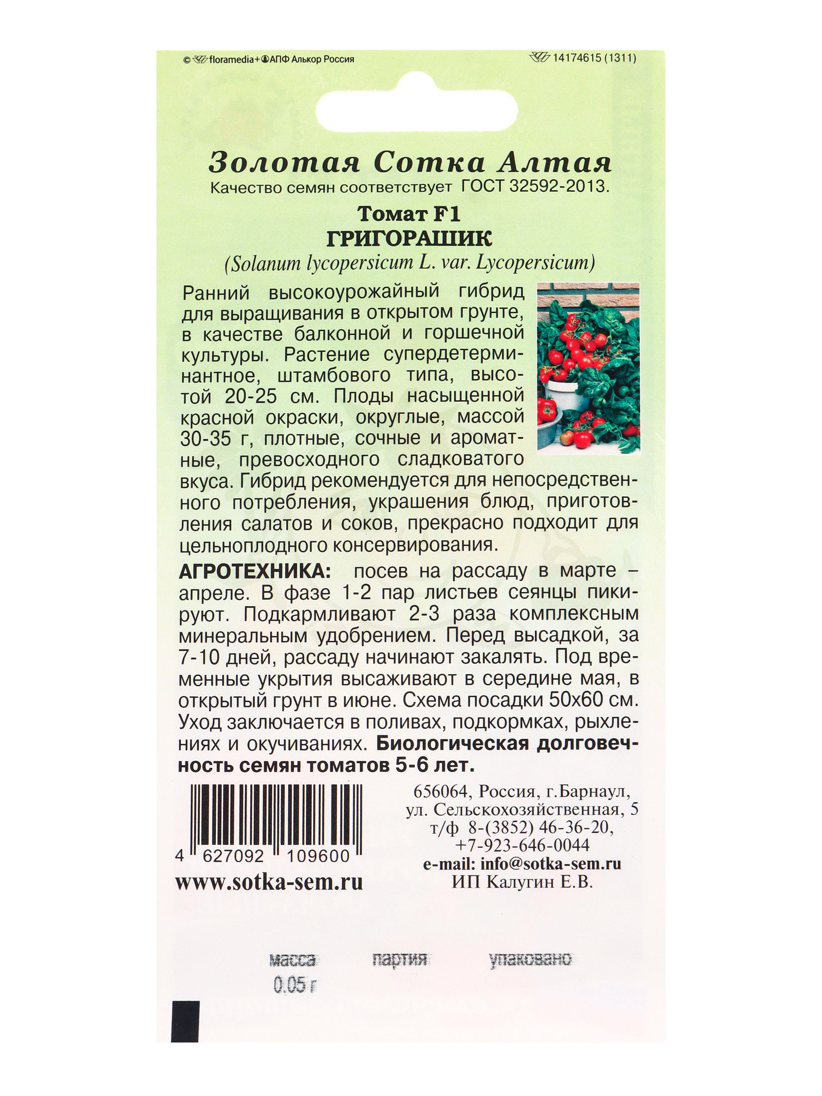 Семена Томат Григорашик F1 /Сотка/ 0.05 г/*2000, Золотая Сотка Алтая, Россия