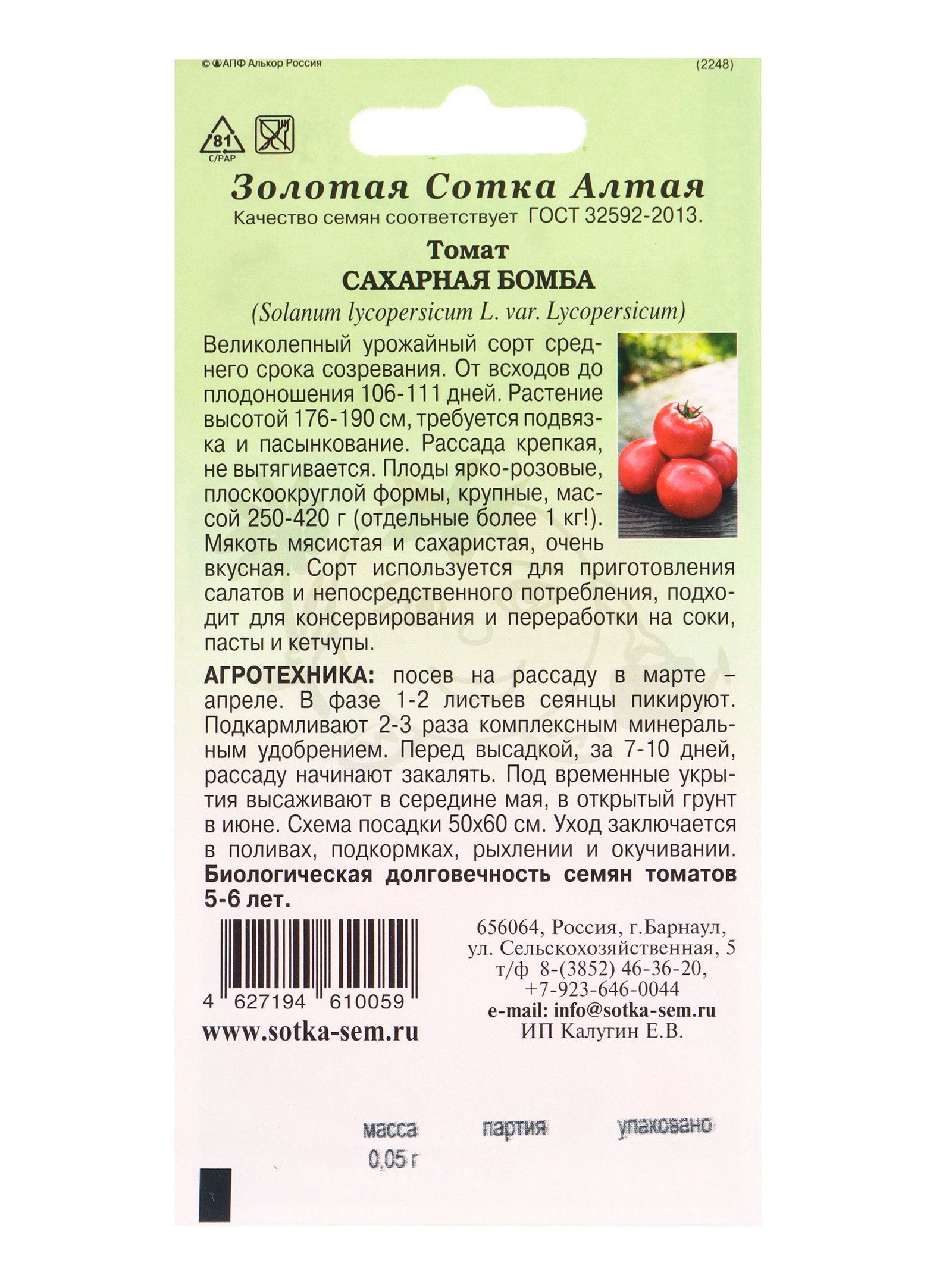 Семена Томат "Сахарная бомба", 0.05 г, среднеспелый, розовый, Золотая Сотка Алтая, Россия