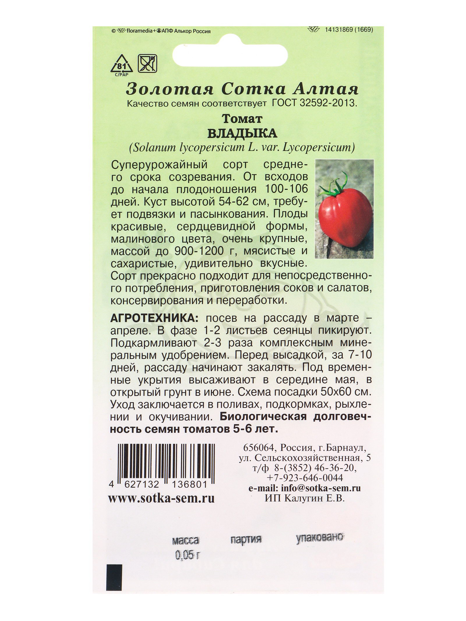 Семена Томат Владыка /Сотка/ 0.05г/ среднесп. штамб малин. до 1кг /*1500, Золотая Сотка Алтая, Россия
