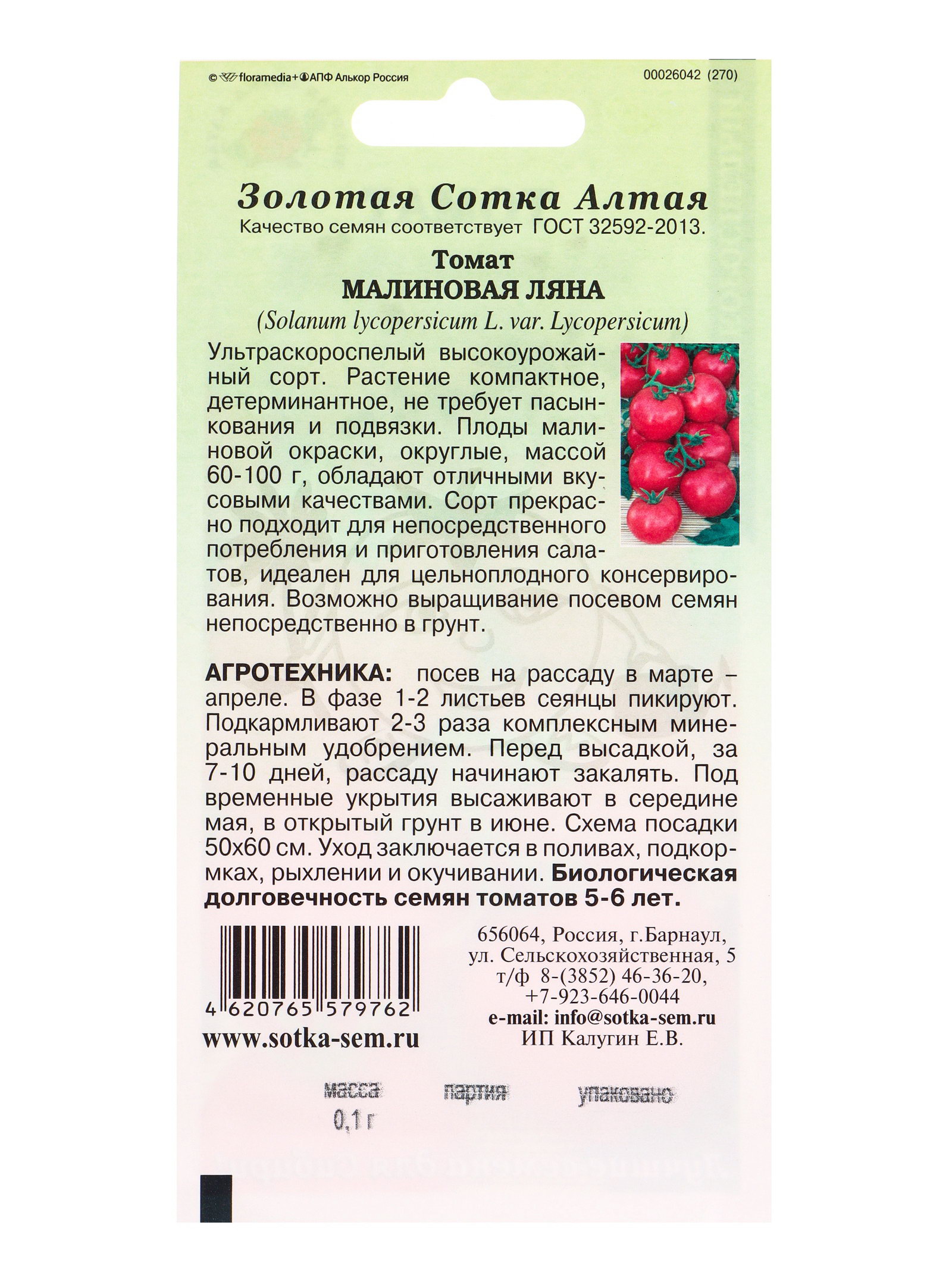 Семена Томат Малиновая ляна /Сотка/ 0.1г/ ультраран. детерм. 60-100г/*1500, Золотая Сотка Алтая, Россия