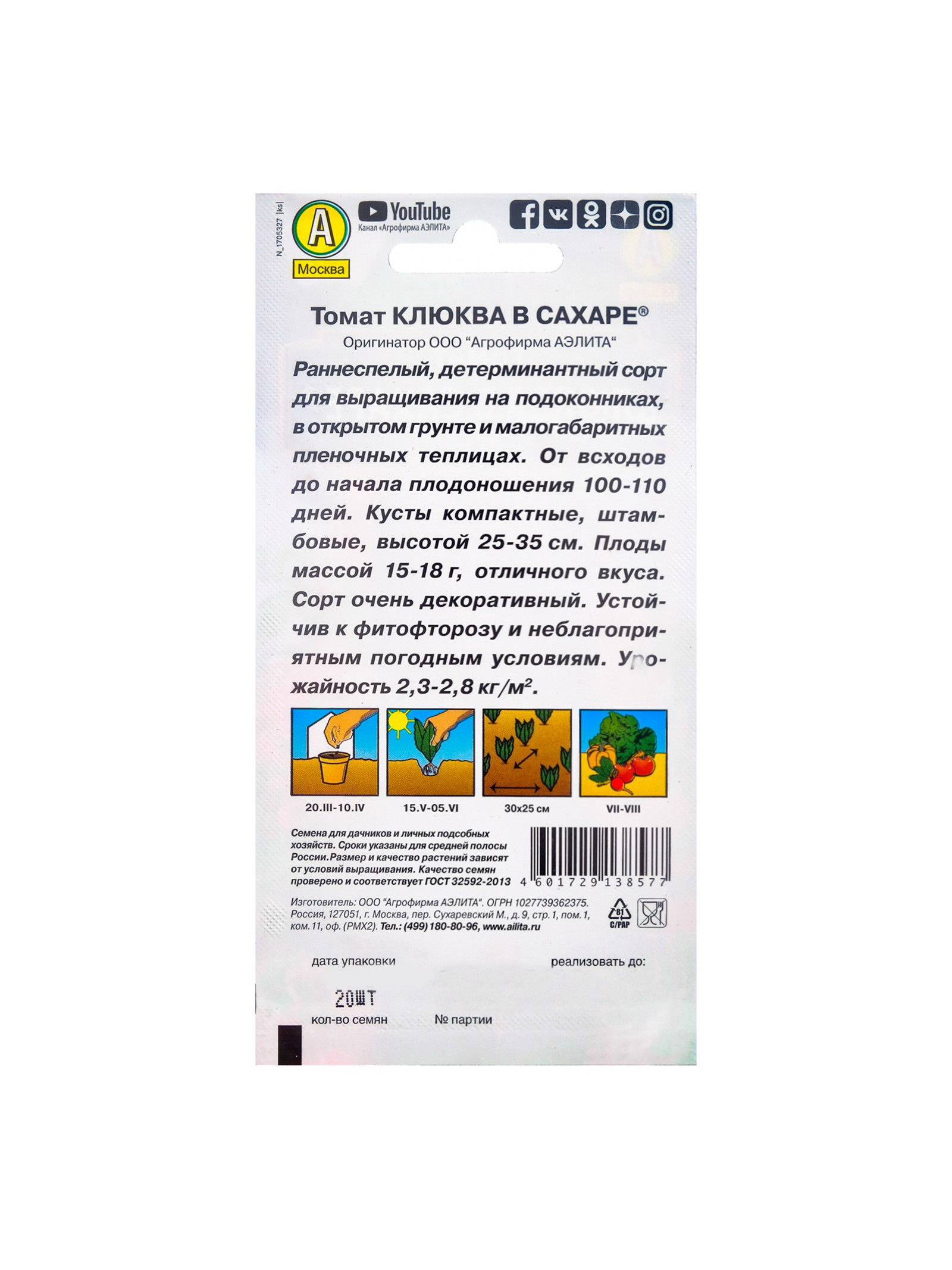 Набор семян Томат "Клюква в сахаре", раннеспелый,детерминантный, 5 шт., 9x17x1 см., Мой выбор, Россия