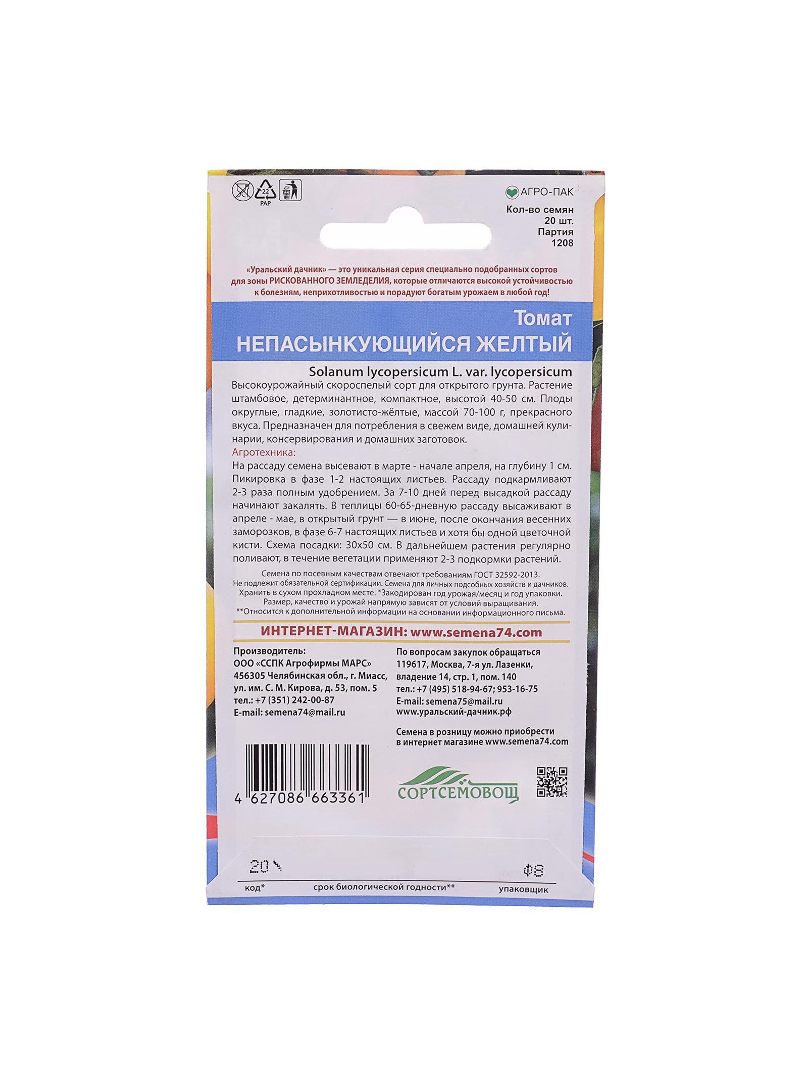 Набор семян Томат "Непасынкующийся Желтый", детерминантный, низкорослый, 5 шт., 9x17x1 см., Мой выбор, Россия