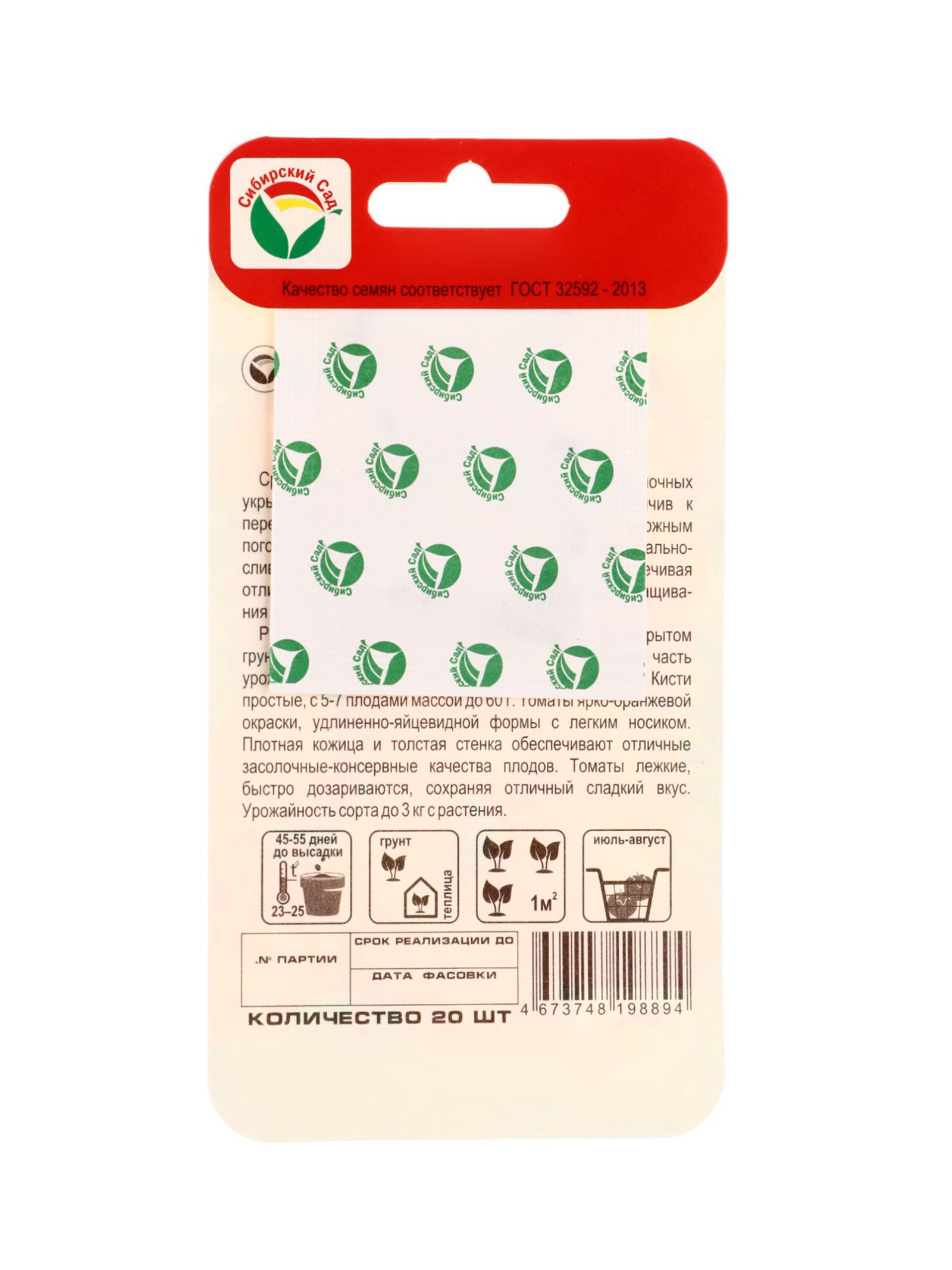 Место выращивания: Закрытый грунт (теплицы, укрытия), Открытый грунт Посев на рассаду: Апрель, Март Размер упаковки: 8 x 0.1 x 15 см. tnved: 1209918000 Температурное ограничение: Нет Нуждаются в пасынковании: Да Форма томатов: Сливовидные Сорт или гибрид: Сорт Урожайность, ?2: [6,8] Применение: Универсальное Вес: Среднеплодные (от 25 до 150 г) Тип роста: Детерминантный (среднерослый) Цвет: Оранжевый Сроки созревания: Среднеранний | ||