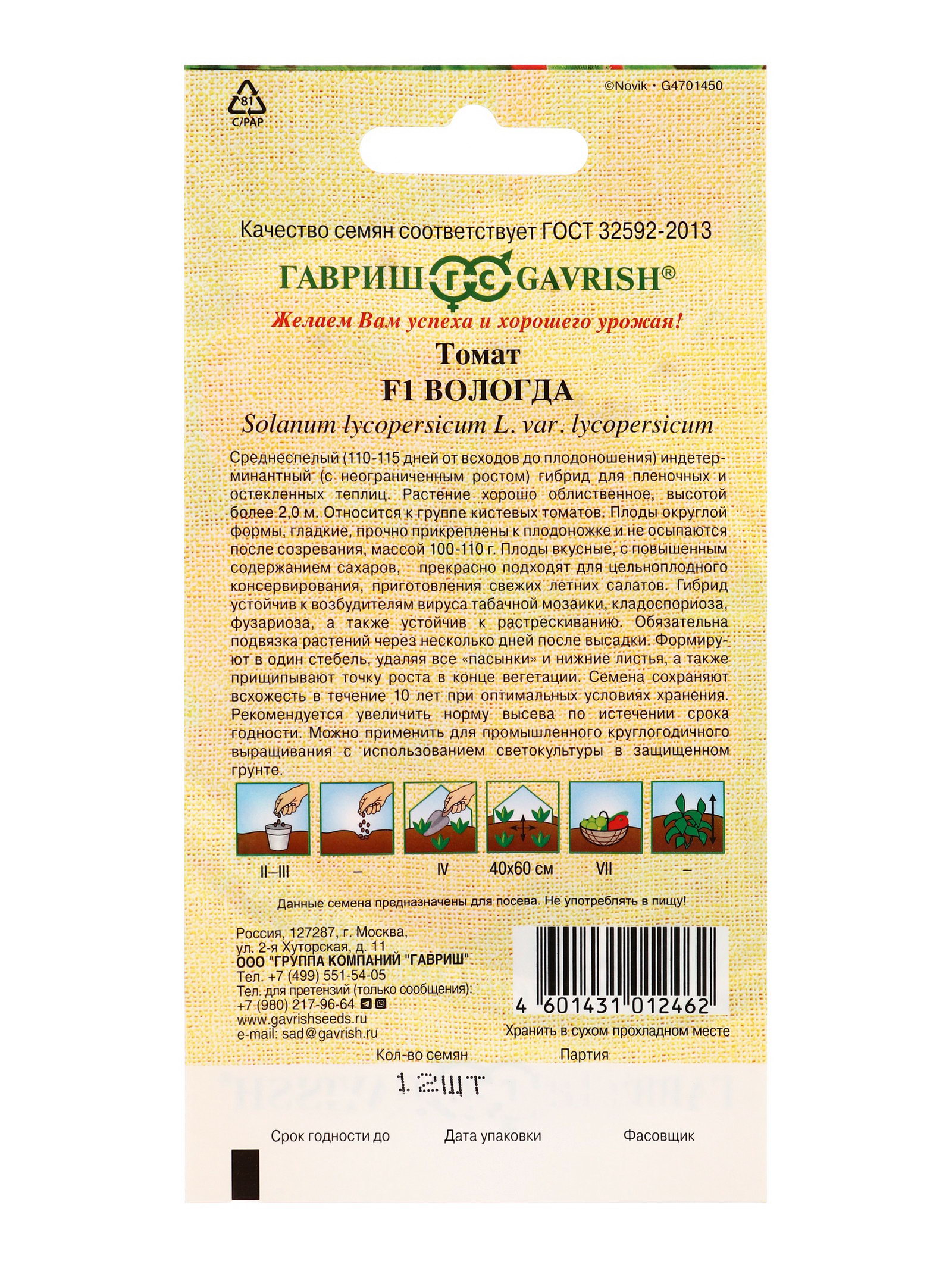 Семена Томат Вологда F1 12 шт. автор., Гавриш, Россия