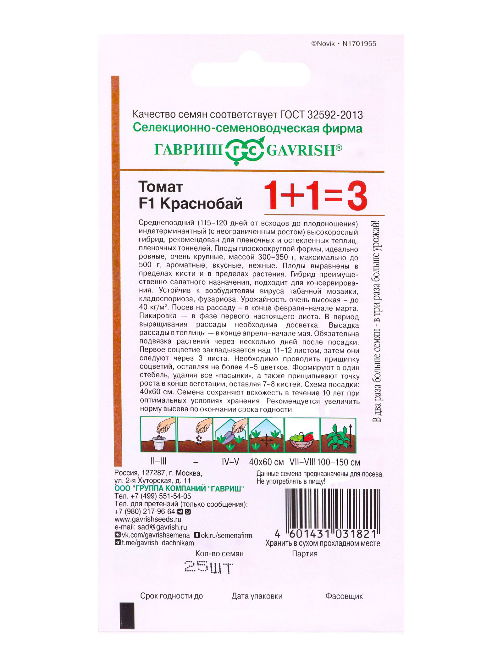 Семена Томат Краснобай F1 серия 1+1/25 шт. автор. DH, Гавриш, Россия