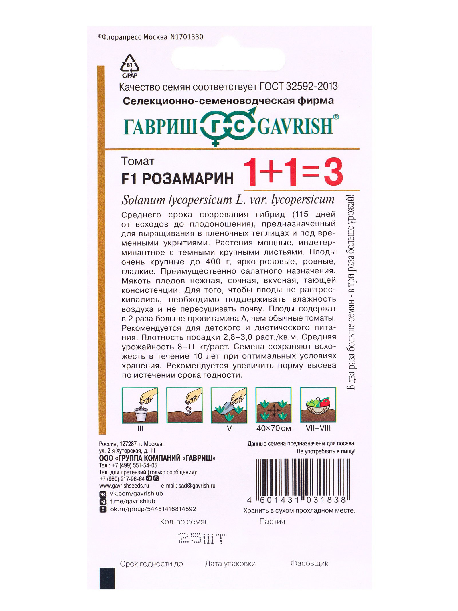 Семена Томат Розамарин F1 серия 1+1/25 шт. автор., Гавриш, Россия