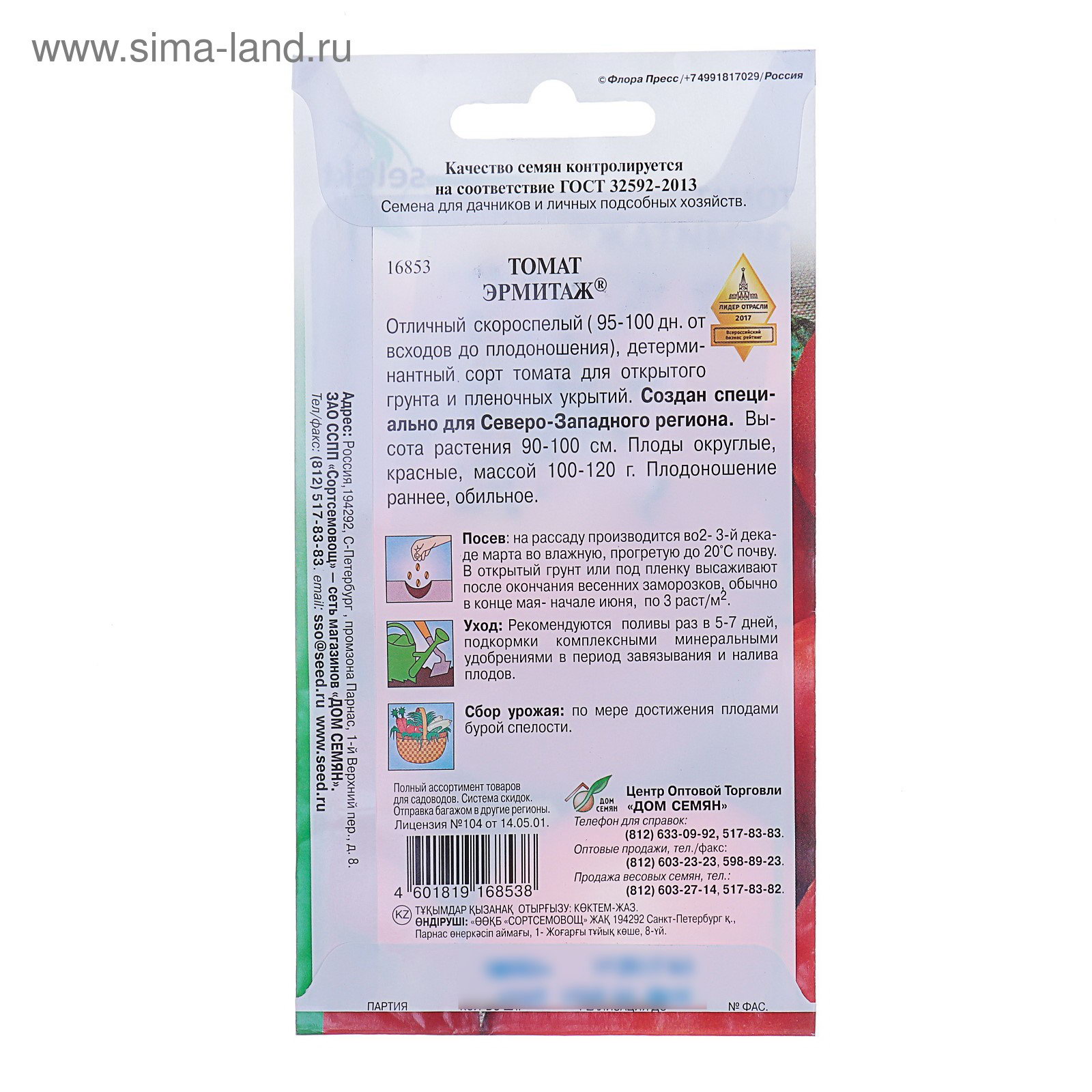 Семена Томат "Эрмитаж" скороспелый, 20 шт, 8x15x0.3 см., Дом семян, Россия