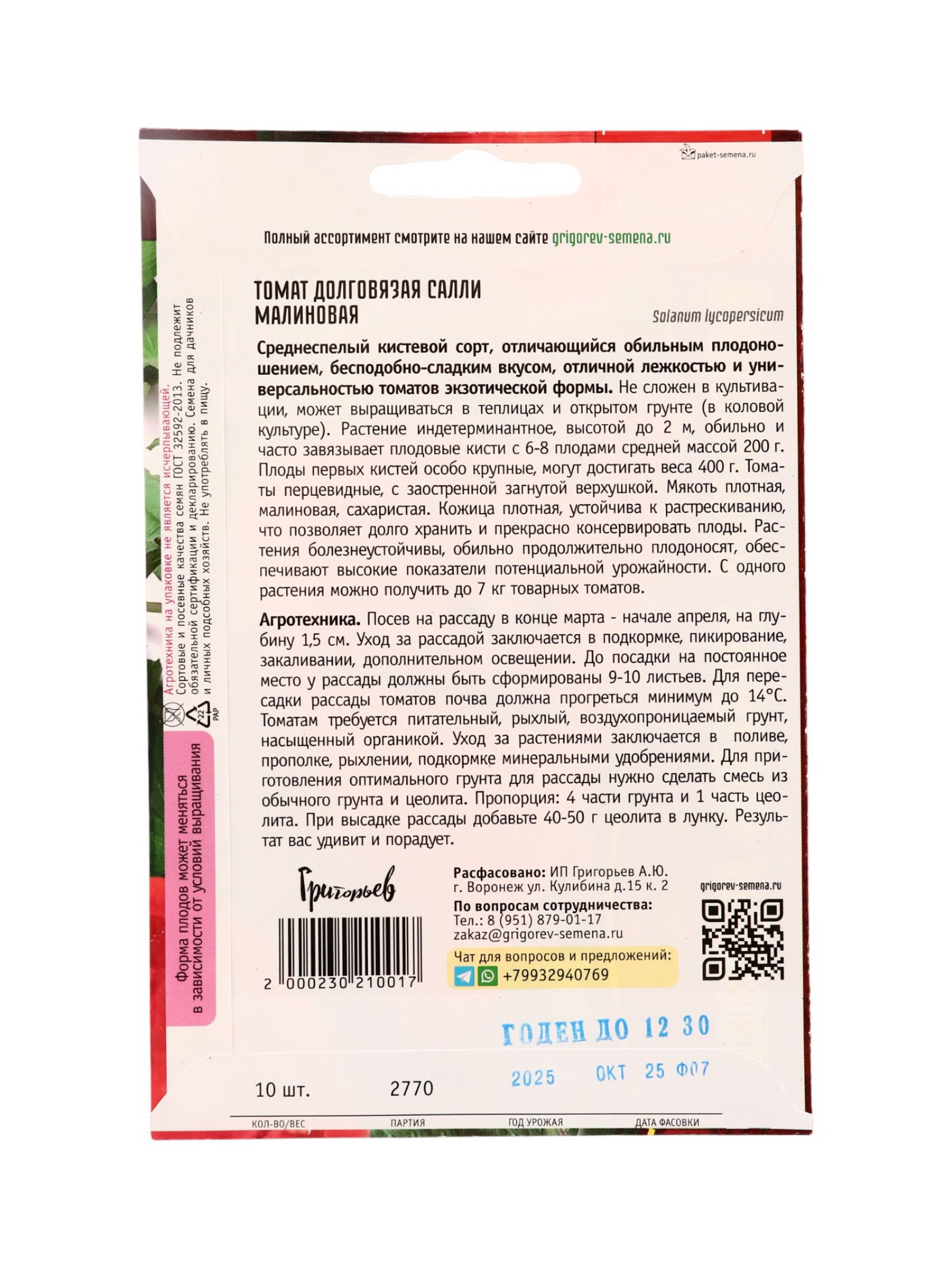 Семена Томат Долговязая Салли Малиновая 10 шт. 12.29 гр, Григорьев, Россия