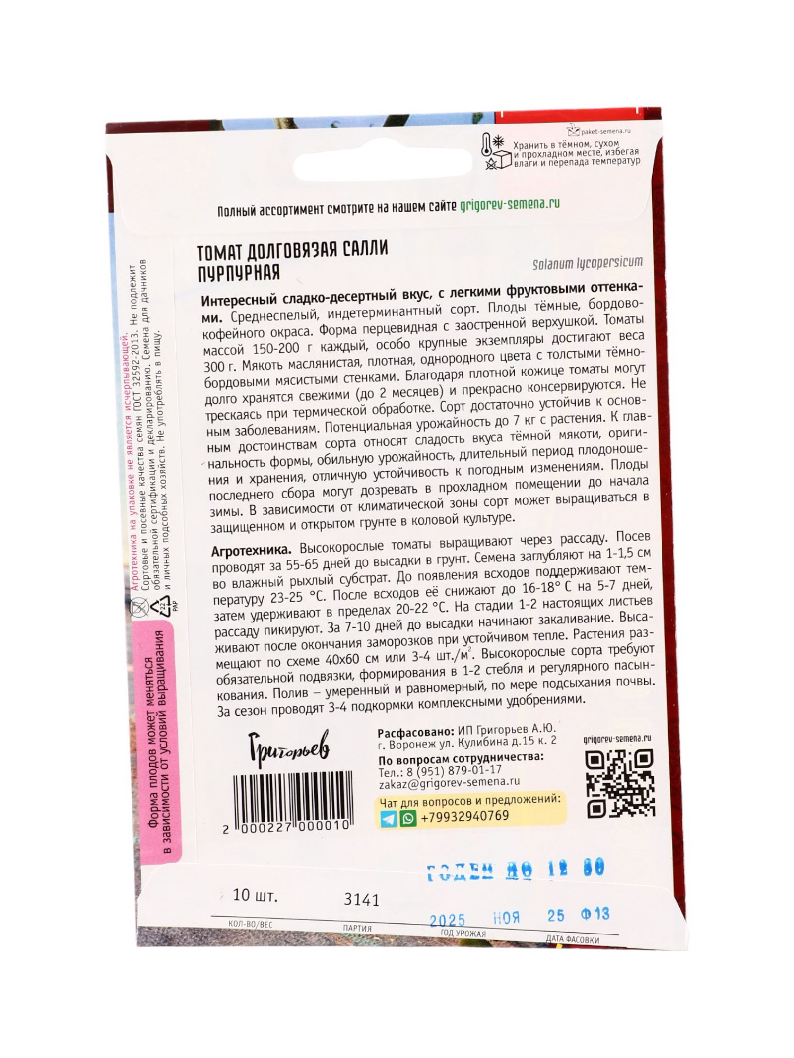 Семена Томат Долговязая Салли Пурпурная 10 шт. 12.29 гр, Григорьев, Россия