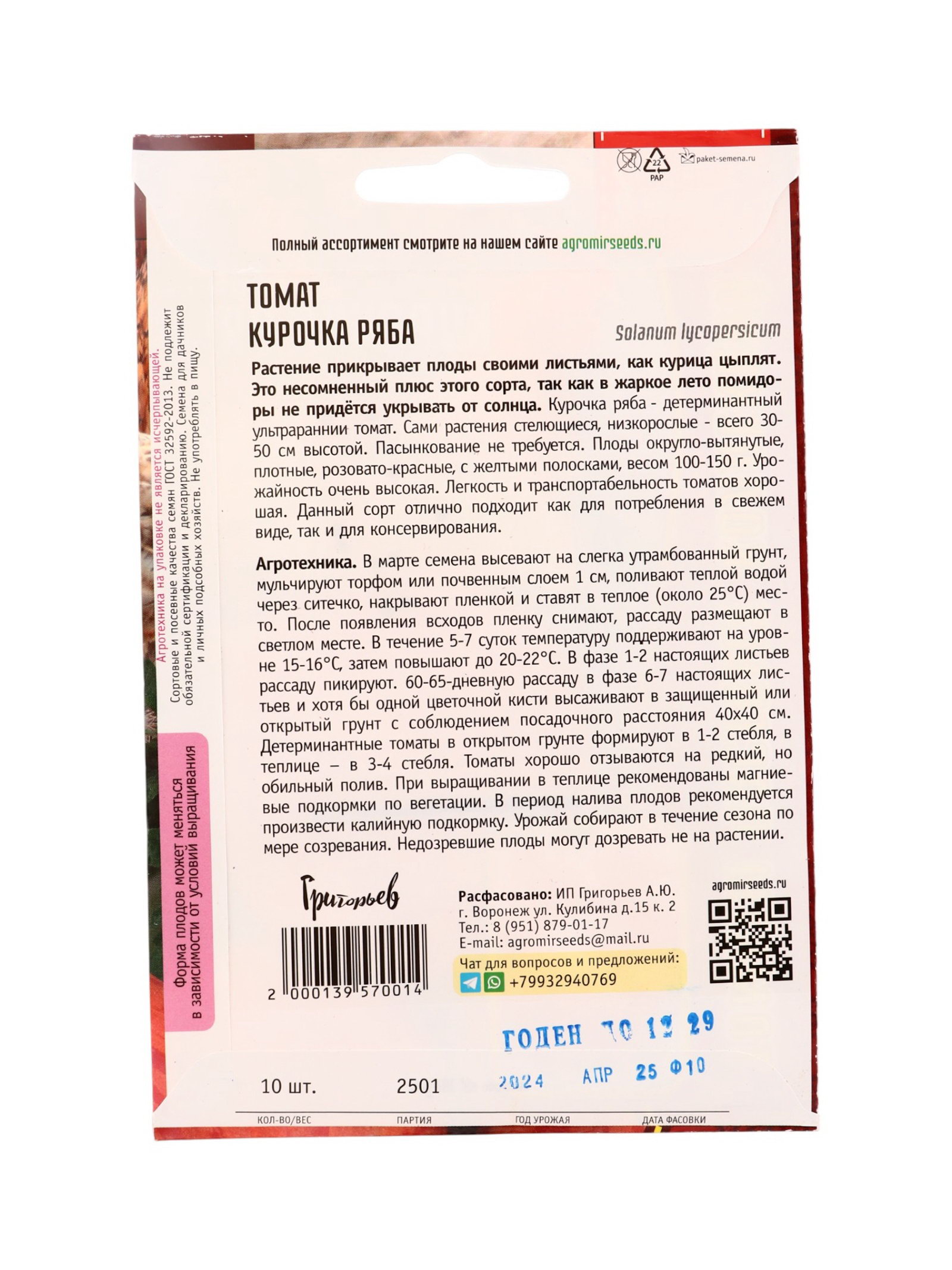 Семена Томат Курочка Ряба 10 шт. 12.29 гр, Григорьев, Россия
