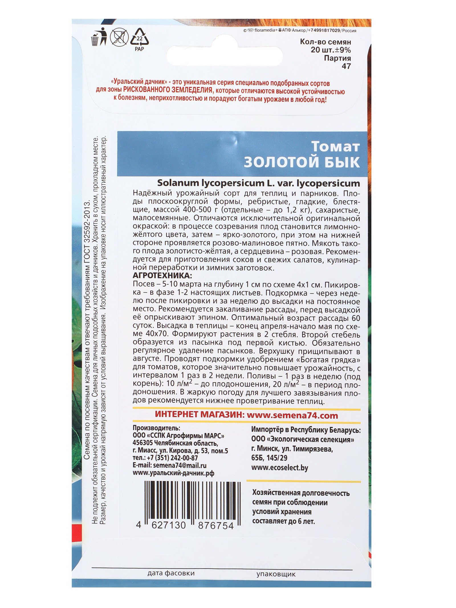 Семена Томат Золотой бык, Уральский Дачник, Россия