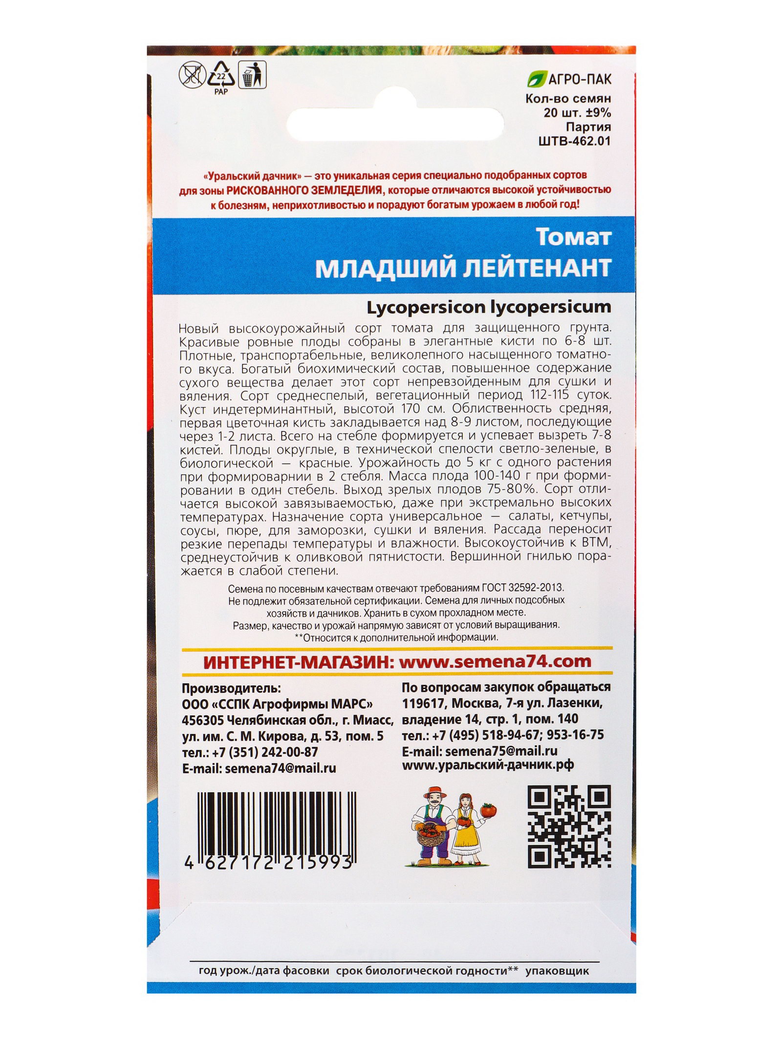 Семена Томат Младший лейтенант, Уральский Дачник, Россия