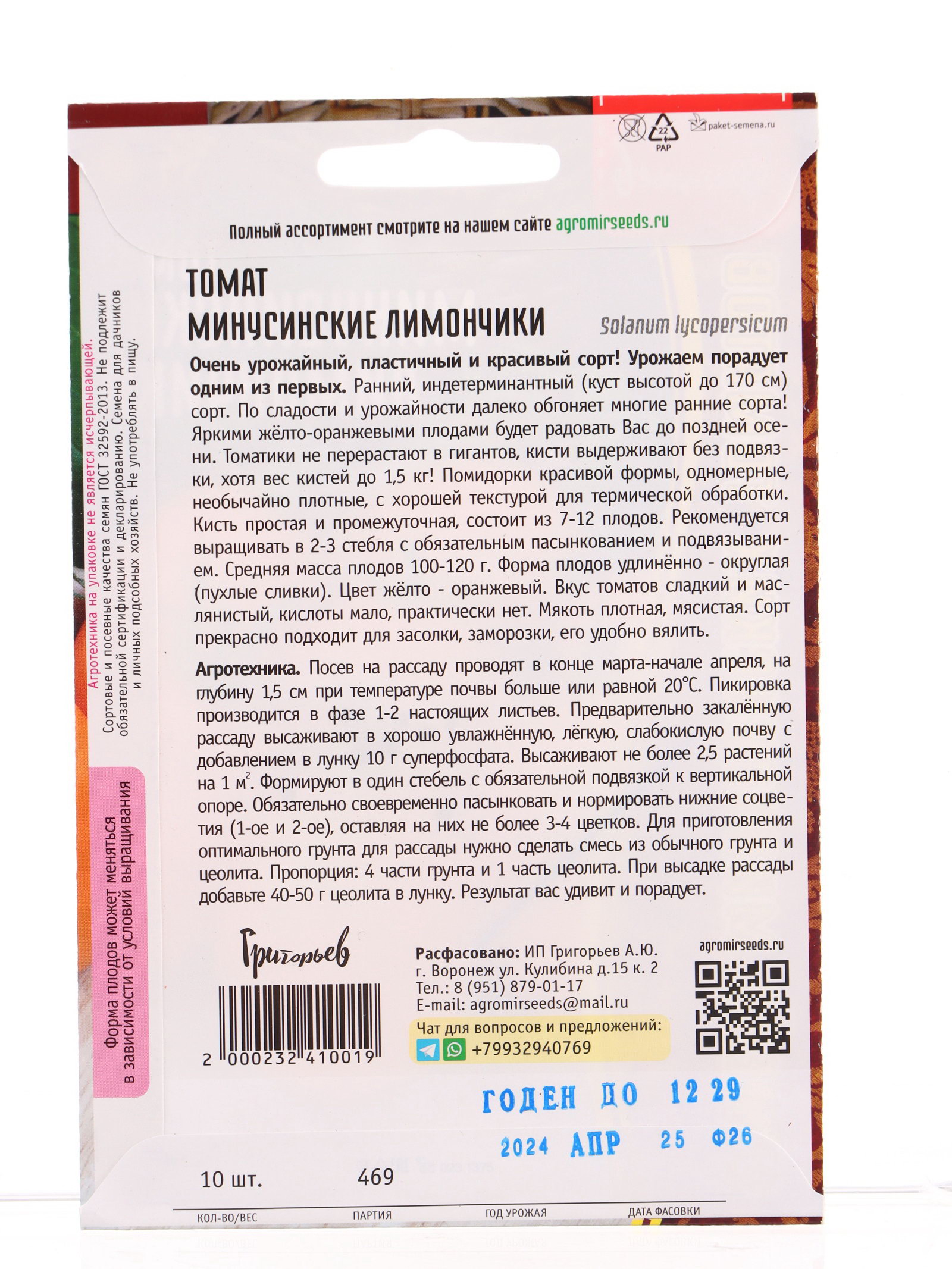 Семена Томат Минусинские Лимончики 10 шт. 12.29 гр, Григорьев, Россия