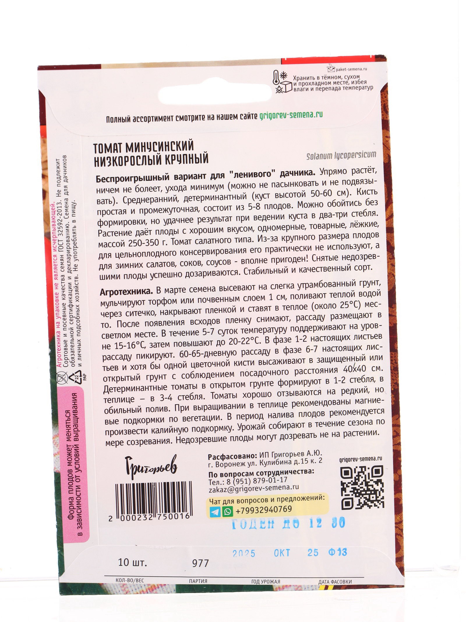 Размер упаковки: 11.5 x 0.1 x 15 см. tnved: 1209918000 Температурное ограничение: Нет Применение: Универсальное Цвет: Красный Сорт или гибрид: Сорт Форма томатов: Круглые Посев на рассаду: Март Место выращивания: Универсальный Нуждаются в пасынковании: Нет Тип роста: Детерминантный (среднерослый) Сроки созревания: Ранний Вес: Суперкрупноплодные (свыше 200 г) | ||
