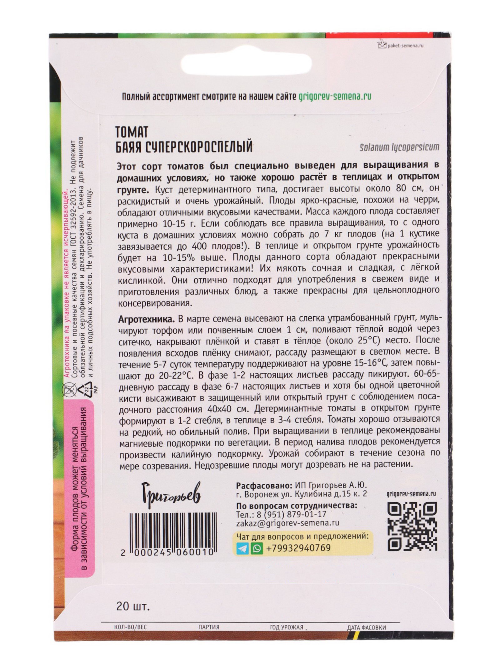 Семена Томат Баяя суперскороспелый 20 шт. 12.29 гр, Григорьев, Россия