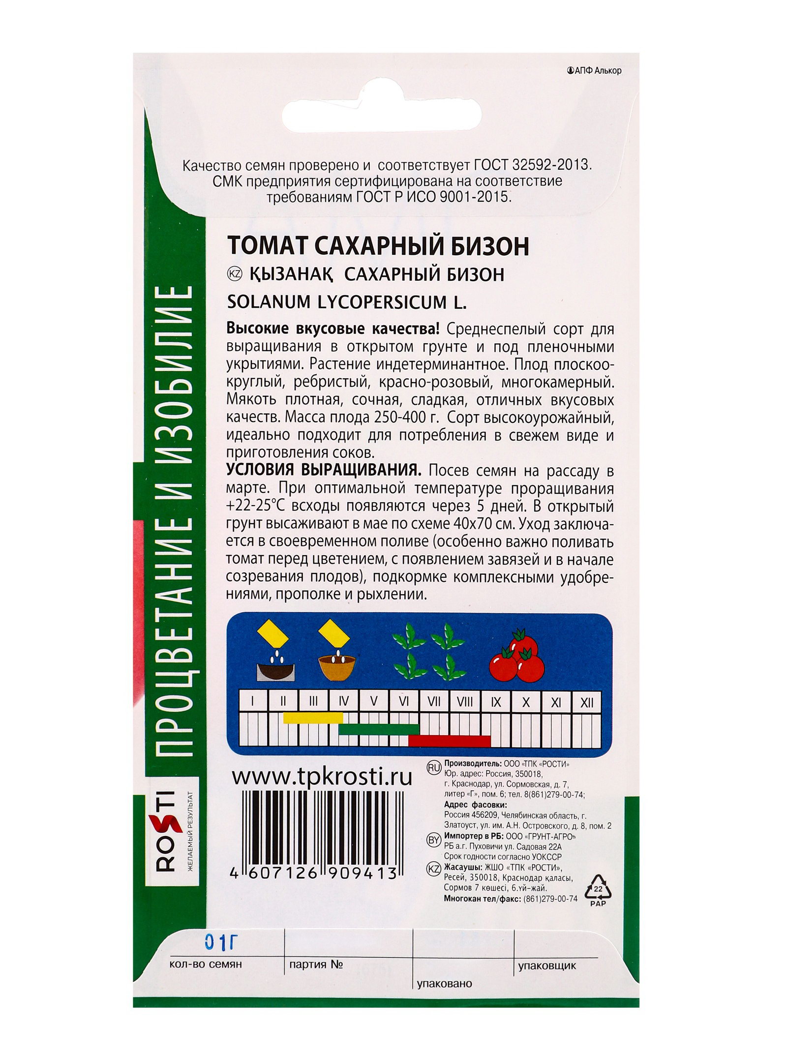 Размер упаковки: 15 x 0.2 x 8 см. Сроки созревания: Средний Вид грунта: Универсальный tnved: 1209913000 Семена "Томат Сахарный бизон", высокорослый, 0,1 г среднеспелый сорт для выращивания в открытом грунте и под плёночными укрытиями. Растение индетерминантное. Плод плоскоокруглый, ребристый, розовый, многокамерный. Мякоть плотная, сочная, сладкая, отличных вкусовых качеств. Масса плода: 250–300 гр Для томата пригодны нетяжёлые, высокоплодородные почвы. Хорошие предшественники огурцы, капуста, бобовые, лук, морковь. На рассаду семена высевают в марте на глубину 2–3 см Перед посевом семена обрабатывают в марганцовке и промывают чистой водой. Пикировка в фазе 1–2 настоящих листьев. Рассаду подкармливают 2–3 раза полным удобрением. За 7–10 дней перед высадкой рассаду начинают закалять. В отапливаемые теплицы рассаду высаживают в апреле, в неотапливаемые плёночные теплицы в мае, в возрасте 60–65 дней. Густота посадки: детерминантные сорта 7–9 растений на 1 ?2, индетерминантные сорта по 3–4 растения на 1 ?2. Высокорослые томаты формируют в 1–2 стебля. 2-й стебель формируют из пасынка, расположенного под первой кистью. Остальные пасынки удаляют, не допуская их перерастания. Высокорослые томаты обязательно подвязывают к горизонтальным или вертикальным шпалерам. В дальнейшем растения регулярно поливают. Для полива используют тёплую воду. В течение вегетации применяют 2–3 подкормки растений. Сорт высокоурожайный, идеально подходит для потребления в свежем виде, переработки и консервирования. | ||