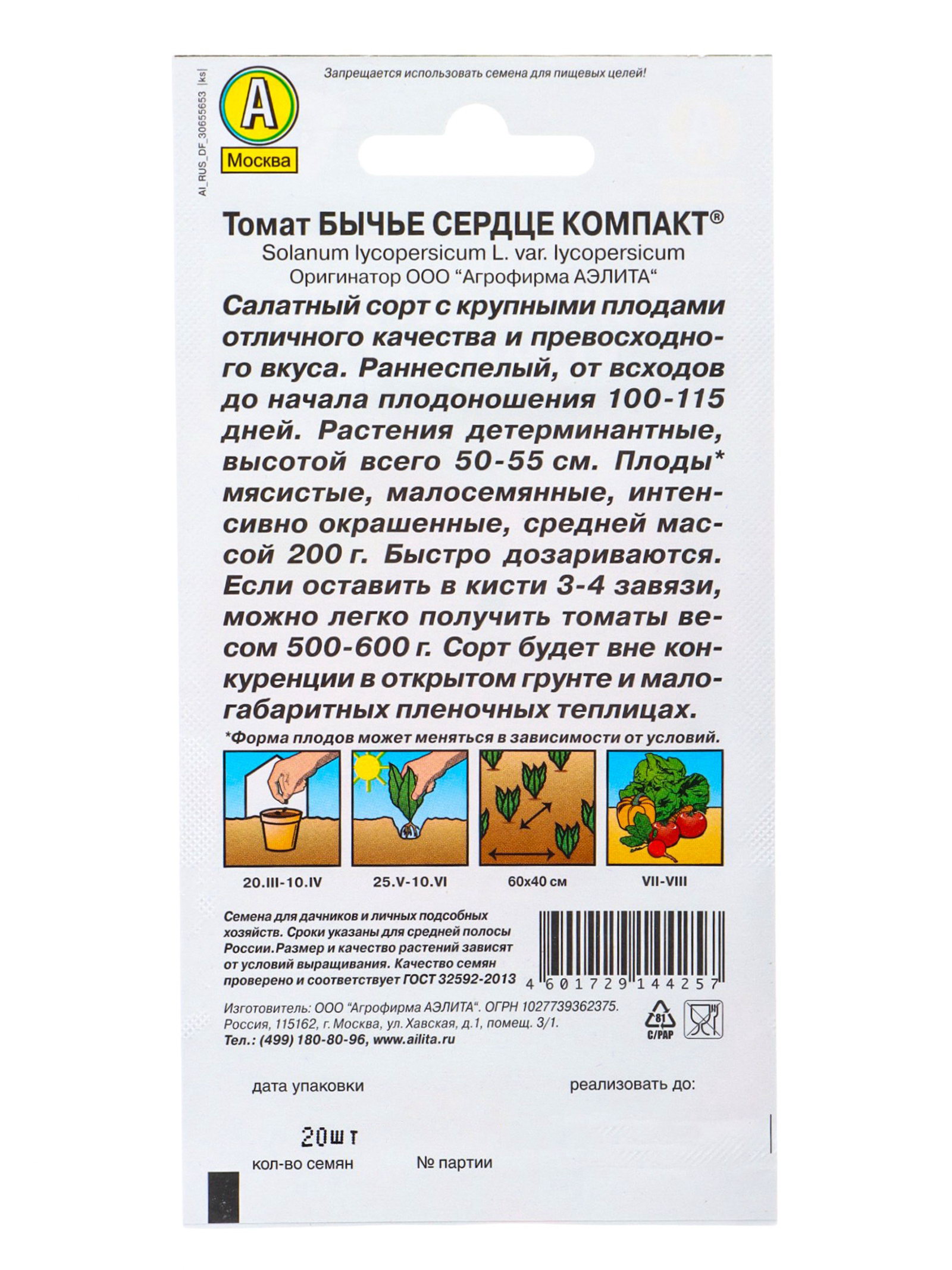Набор семян Томат раннеспелый и низкорослый "Бычье сердце компакт", 20 шт. семян, 15x17x5 см., Мой выбор, Россия