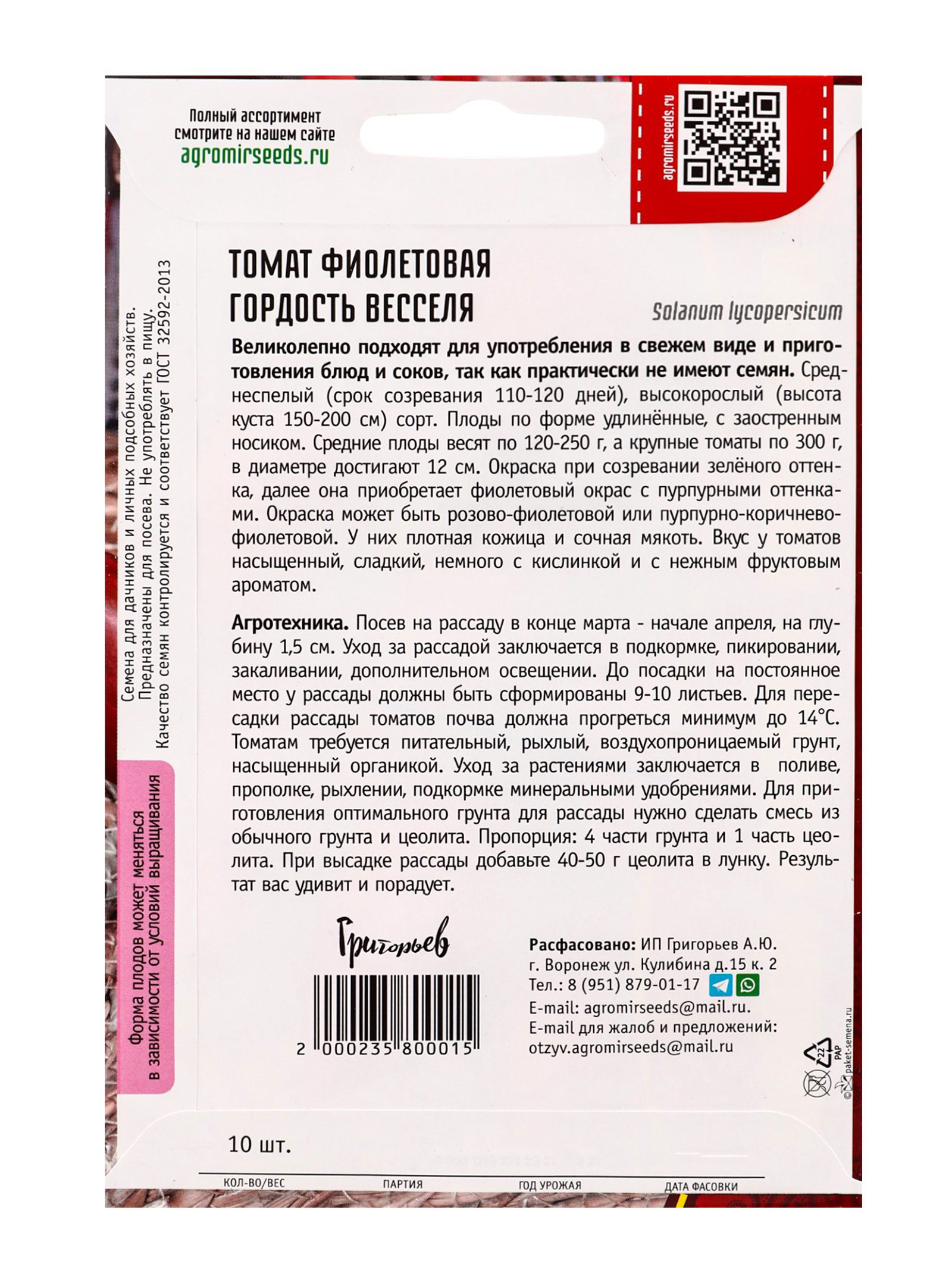 Посев на рассаду: Апрель, Март Размер упаковки: 11.5 x 0.1 x 15 см. tnved: 1209918000 Температурное ограничение: Нет Место выращивания: Универсальный Сорт или гибрид: Сорт Форма томатов: С носиком Цвет: Фиолетовый Нуждаются в пасынковании: Да Сроки созревания: Средний Применение: Универсальное Тип роста: Индетерминантный (высокорослый) Вес: Суперкрупноплодные (свыше 200 г) | ||