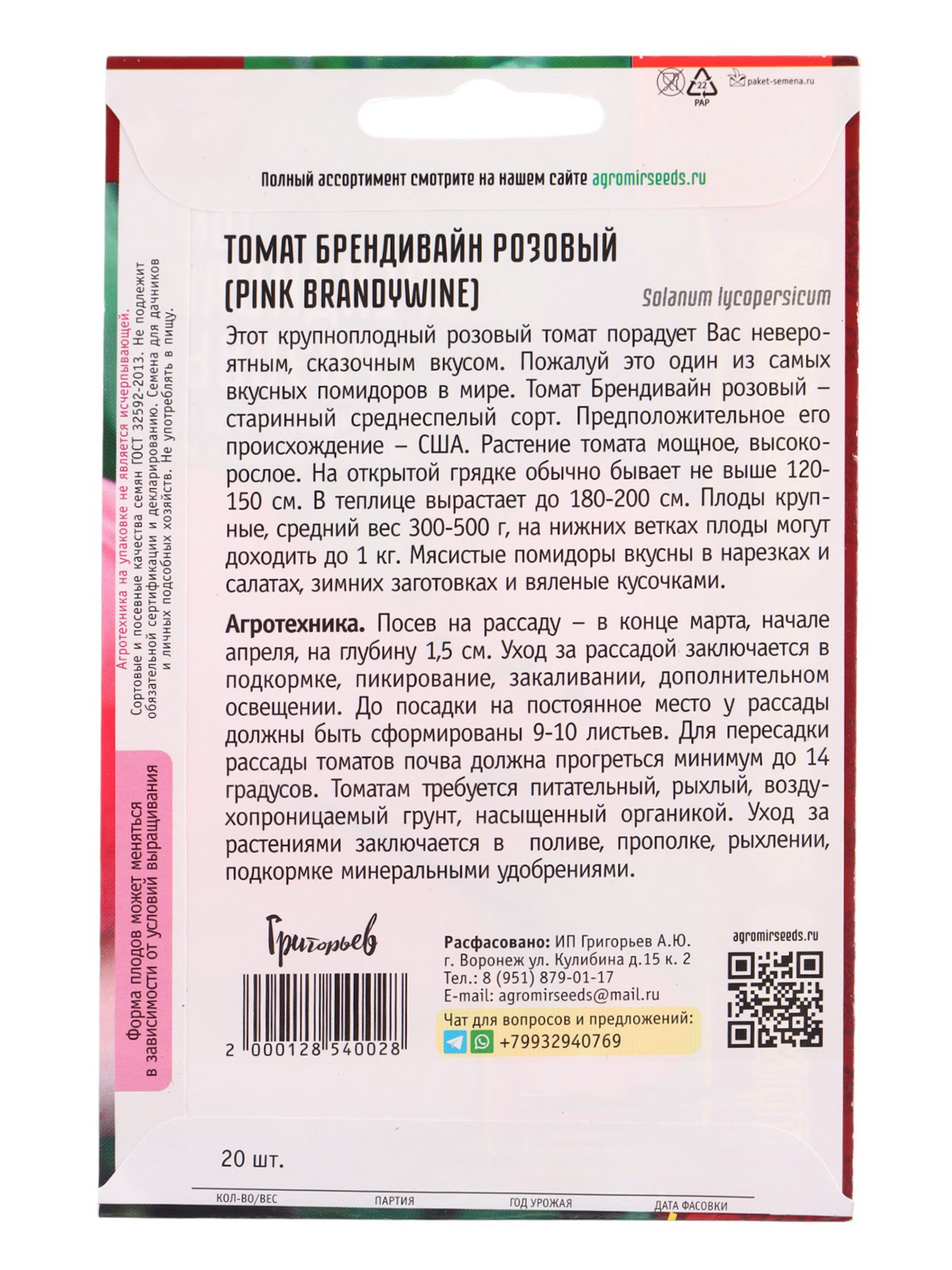 Семена Томат Брендивайн Розовый, Григорьев, Россия