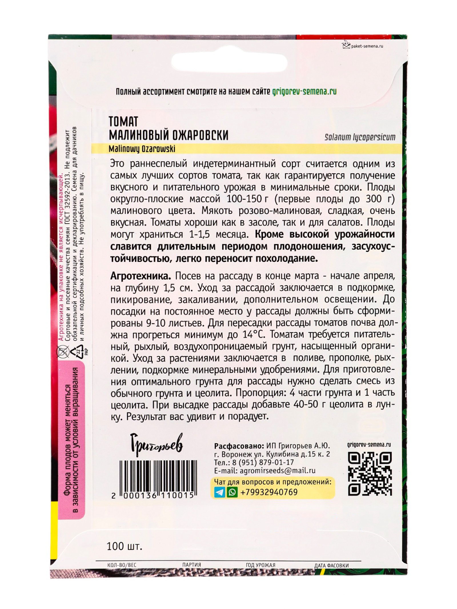Семена Томат Малиновый Ожаровски 100 шт. 12.29 гр, Григорьев, Россия