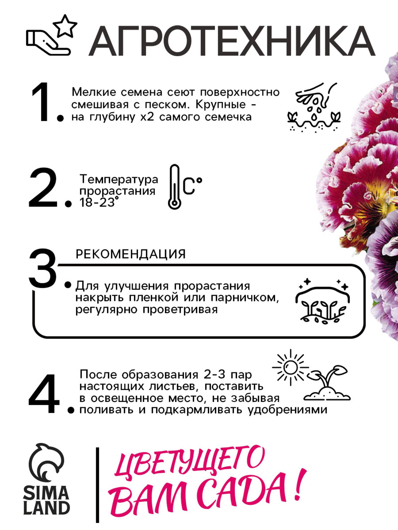 Размер упаковки: 8 x 0.2 x 15 см. Температурное ограничение: Нет Махровые: Нет Сухоцвет: Нет Место выращивания: Универсальный Цвет: Разноцветный Сорт: F1 Вид: Виола Вегетация: Двулетники По форме куста: Кустовая Назначение: Для создания цветников, клумбы Разновидность: Цветущее Отношение к свету: Рассеянный свет Нуждаются ли в стратификации: Нет Нуждаются ли в стратификации: Нет tnved: 1209999900 Двулетнее популярное растение из семейства Фиалковые высотой 20-25 см Цветки оранжевого цвета с черными штрихами в центре, диаметром 6-8 см Лепестки с фантастической гофрировкой, украшены рюшами. Степень выраженности бахромчатости лепестков зависит от температуры, она увеличивается в прохладных условиях. Ровный габитус, улучшенная форма растений, раннее и обильное цветение позволяют широко использовать эту виолу в профессиональном плане. Цветет обильно и продолжительно с мая по сентябрь. Влаголюбива, холодостойка, хорошо растет на солнце и в полутени. Для получения растений, цветущих в год посева, семена высевают на рассаду в феврале-марте. Всходы появляются через 5-7 дней. В открытый грунт рассаду высаживают в конце апреля-начале мая на расстоянии 20 см Растения хорошо переносят пересадку в цветущем состоянии. При посеве в открытый грунт в июне-июле цветение наступает во второй год. Используют для посадки массивами, на клумбы, рабатки, в балконные ящики и садовые вазы. | ||