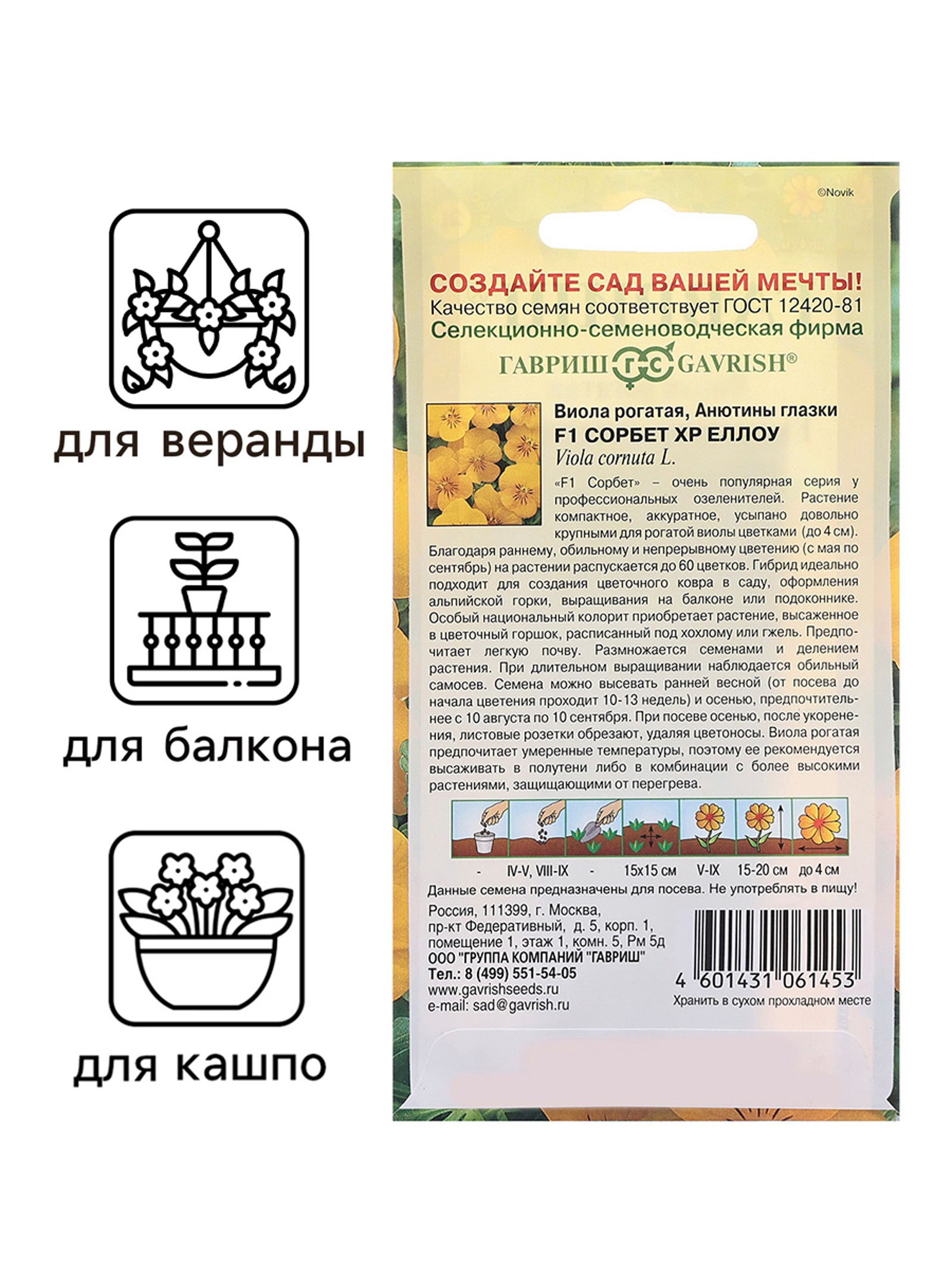 Размер упаковки: 8 x 0.2 x 15 см. Температурное ограничение: Нет Цвет: Жёлтый Место выращивания: Универсальный Сорт: F1 Сухоцвет: Нет Махровые: Нет Вид: Виола По форме куста: Кустовая Вегетация: Двулетники Назначение: Для создания цветников, клумбы Разновидность: Цветущее Отношение к свету: Светолюбивые Нуждаются ли в стратификации: Нет tnved: 1209999900 tnved: 1209999900 "F1 Сорбет" - очень популярная серия среди профессиональных озеленителей. Формирует компактный аккуратный кустик, усыпанный довольно крупными для рогатой виолы цветками (до 4 см). Благодаря раннему, обильному и непрерывному цветению (с мая по сентябрь) на кустике распускается до 60 цветков. Гибрид идеально подходит для создания цветочного ковра в саду, оформления альпийской горки, выращивания на балконе или подоконнике. Особый национальный колорит приобретает растение, высаженное в цветочный горшок, расписанный под хохлому или гжель. Предпочитает легкую почву. Размножается семенами и делением куста. При длительном выращивании наблюдается обильный самосев. Семена можно высевать ранней весной (от посева до начала цветения проходит 10-13 недель) и осенью, предпочтительнее с 10 августа по 10 сентября. При посеве осенью, после укоренения, листовые розетки обрезают, удаляя цветоносы. Для получения дружных всходов при весеннем посеве семена стратифицируют при температуре +10оС. Виола рогатая предпочитает умеренные температуры, поэтому ее рекомендуется высаживать в полутени, либо в комбинации с более высокими растениями, защищающими от перегрева. Отлично смотрится на полутенистой альпийской горке. | ||