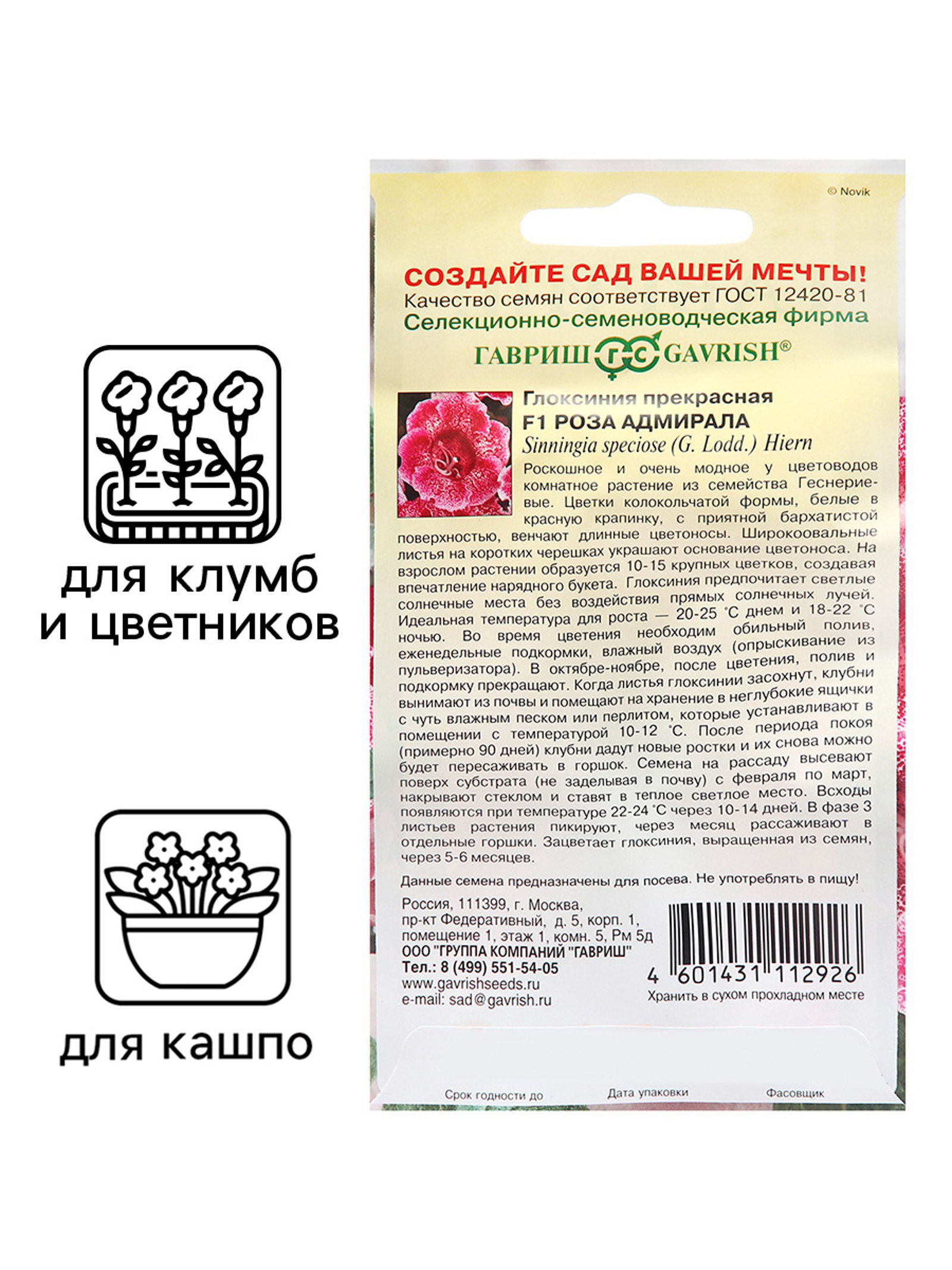 Семена Глоксиния прекрасная "Роза адмирала", ц/п, F1, 4 шт, Гавриш, Россия